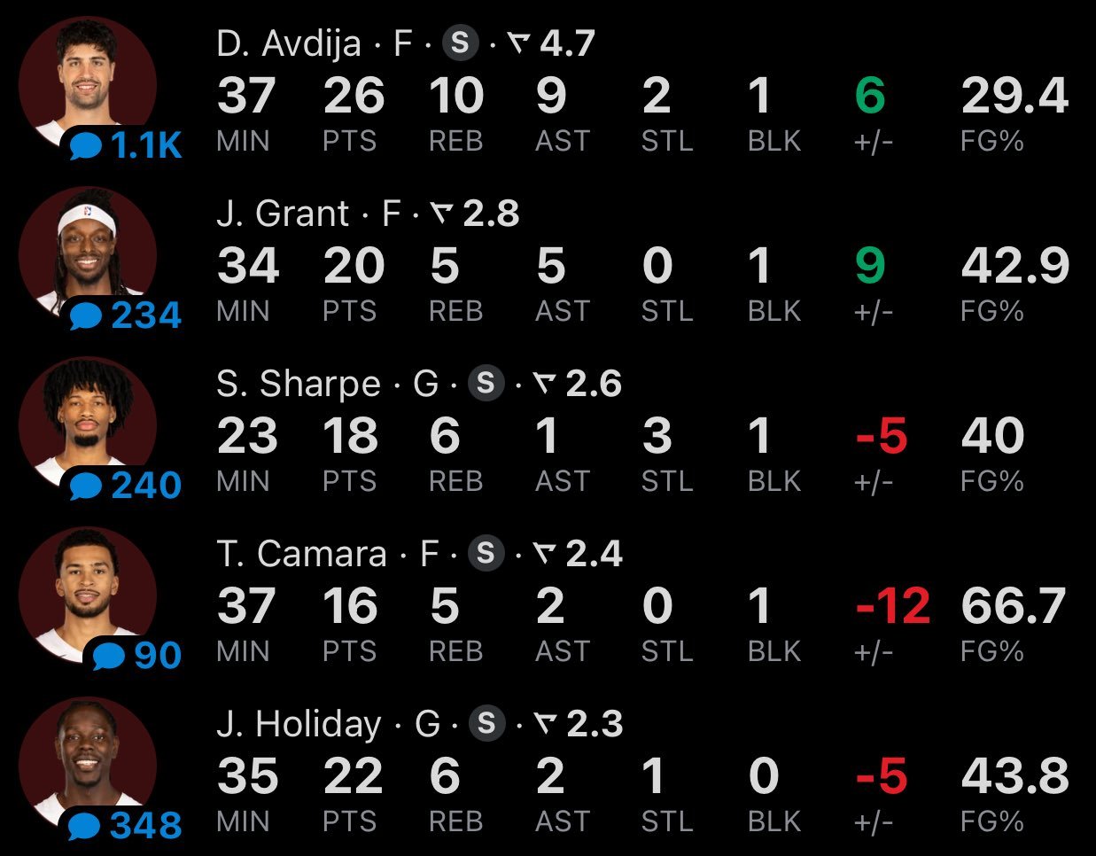 阿夫迪亚在前11投0中的情况下,后6投5中,末节11分3助攻,带领开拓者逆转卫冕冠军。霍勒迪+卡马拉投出15中9的三分,替补的杜普·里斯三分5中4!开拓者的5场胜利包括赢雷霆、掘金、湖人、勇士。