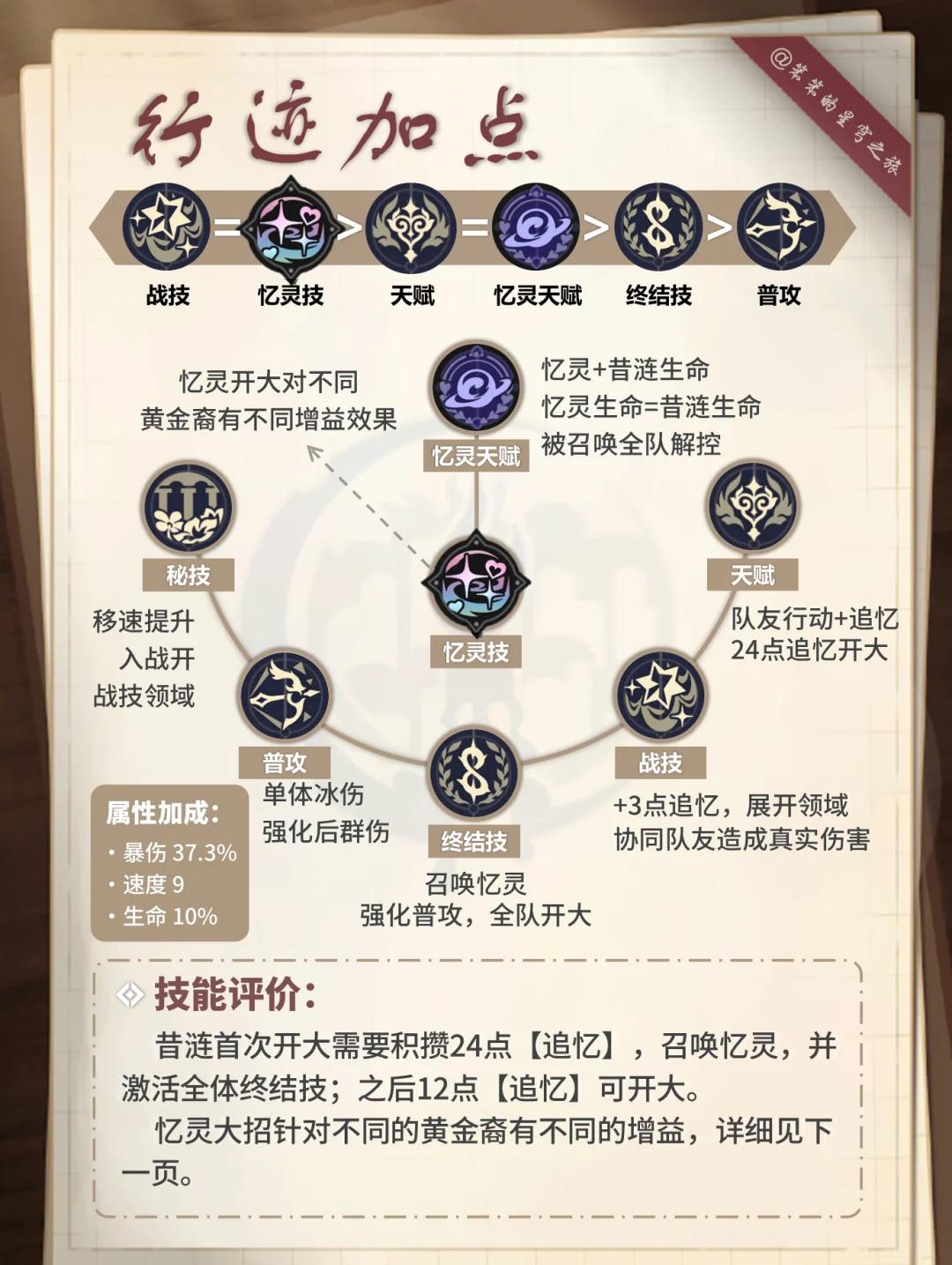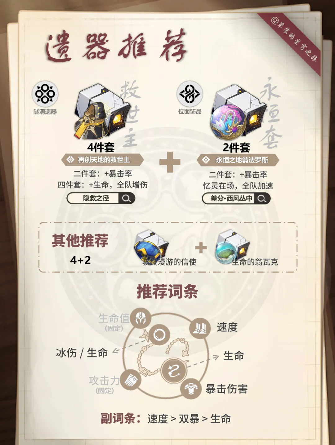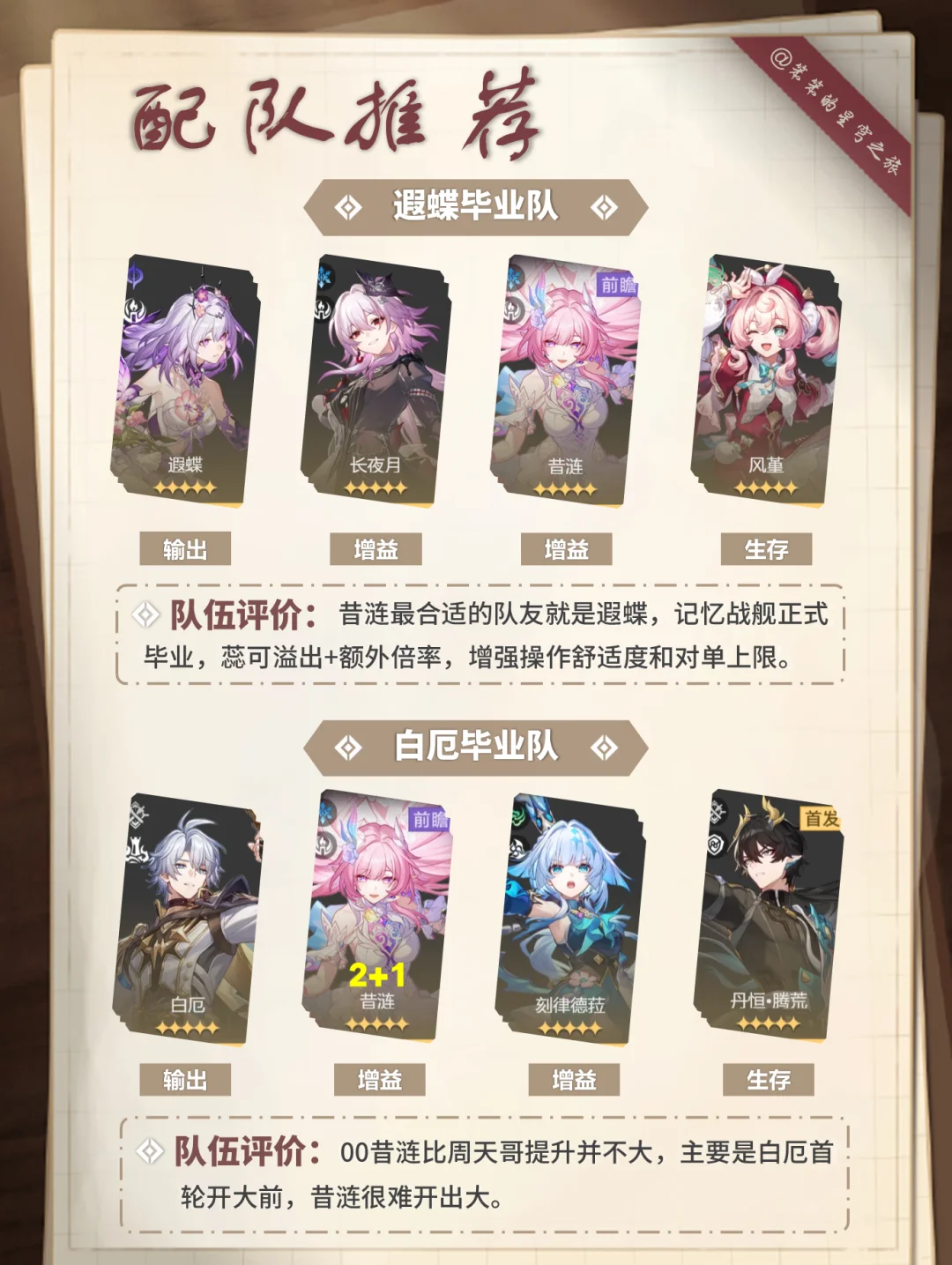 🐱大家好,我是笨笨的铲屎官 昔涟的培养攻略来了 ▶专武优先 不然记忆光锥能选的太少了 平民就只能用两把兑换光锥 都是抢着用的 ▶遗器外圈救世主 内圈全新套装,3.7上线了再刷 主词条暴伤衣、速度鞋 冰/生命球、生命绳 ▶额外天赋+50%的暴击 暴击衣就没必要了 速度180的阈值,压力有点大啊 充能绳没用,昔涟是特殊大招 球哪个副词条好选哪个 ▶配队: 首选当然遐蝶记忆战舰 白厄的话,00昔涟启动有点慢 推荐2+1昔涟配白厄