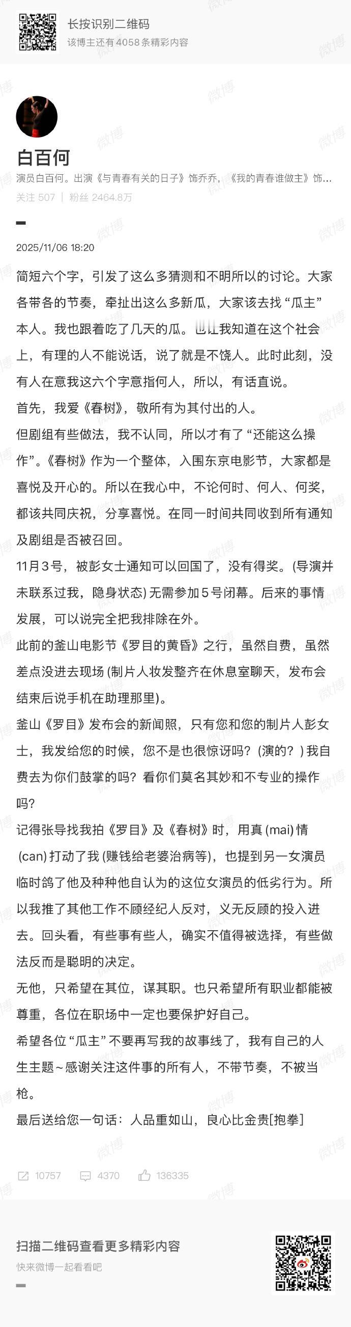 果然,白百何是受委屈了…… 看看白百何的发文,毫无意外、意料之中、毫无惊喜,总