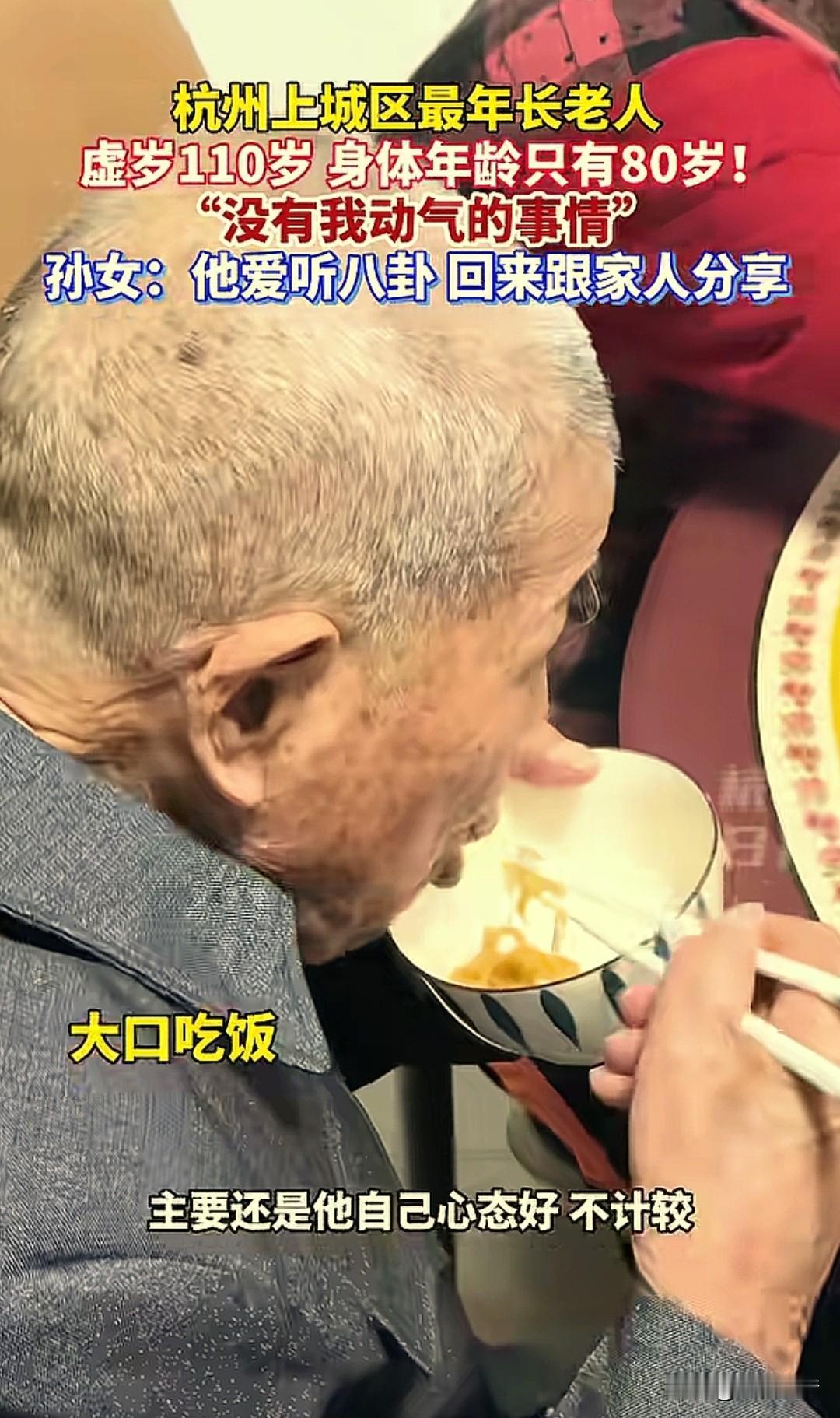 浙江杭州,上城区出现一位最年长老人,年龄110岁,而身体看上去竟然只有80岁,老人笑呵呵的说:“没有什么能让我动气的事。”随后,还分享了一个长寿秘诀。 视频里这位精神头十足的老人马爷爷,看起来根本不像人们印象中苍老干枯,挪不动步子的人。他精神饱满,脸上的皱纹也只像80多岁的老人,岁月像是格外眷顾他。 同样是拐走路,他腿脚看起来更利落,就连背也是笔直的。并且老人家胃口特别好,一顿一大碗饭,整个人总是带着笑容和和气气。 老人还对着镜头,说出了自己的长寿秘诀,除了脾气好,不计较,最大的爱好就是听八卦,马爷爷时常会把外面听来的有趣的事情和见闻,分享给家人听,有什么事也不会堆在心里。 根据孙女透露,爷爷年轻时是泥瓦匠,还得了当地的劳模,现在老了,五世同堂,很多年前就开始享福了。 在长寿方面或许基 因占主 导地位,可好的心态也是一件不容忽视的事情。 有网友说,这家人真是有福气,有这么大年纪的老寿星,一定是幸福之家。