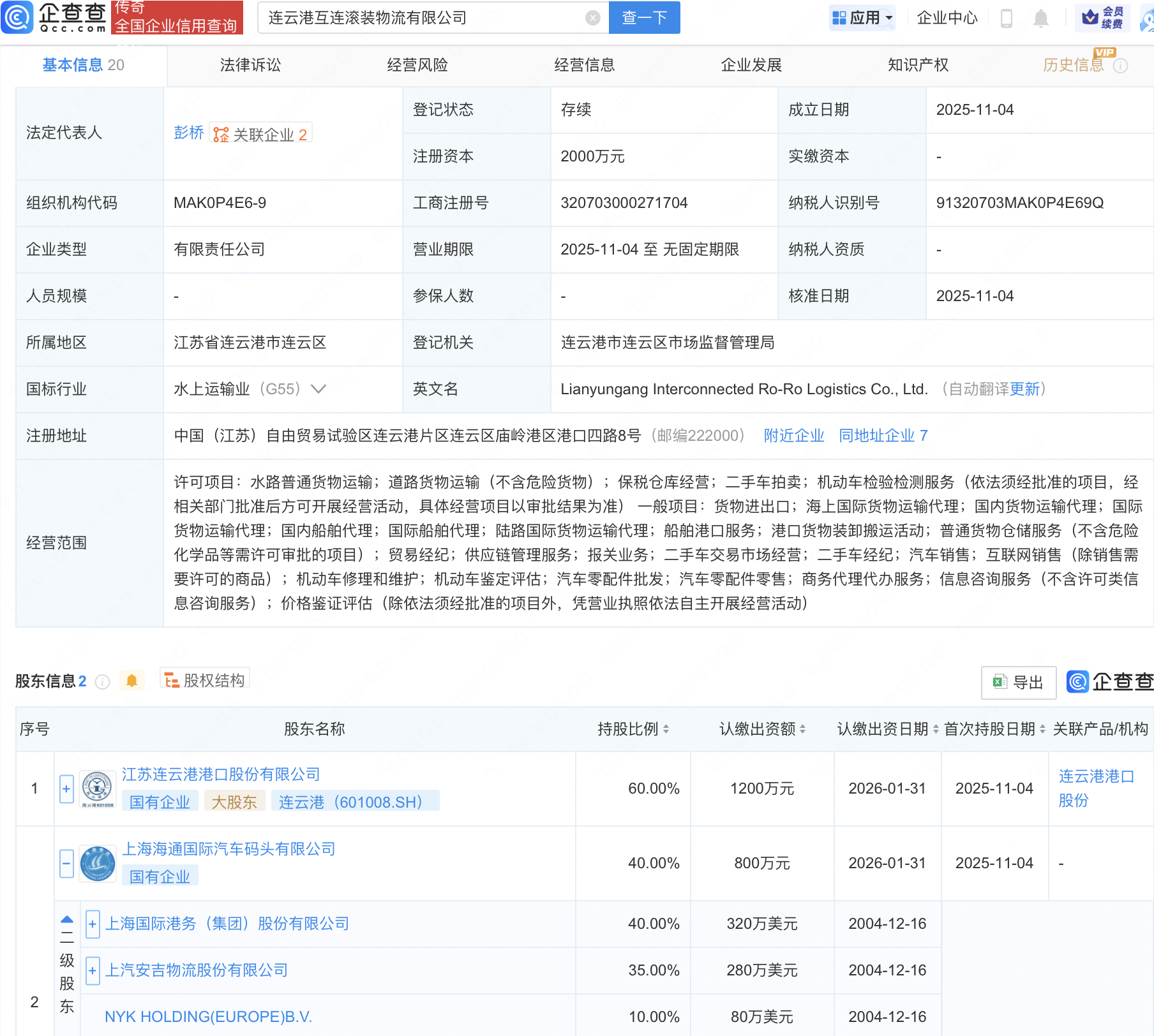 企查查APP显示,近日,连云港互连滚装物流有限公司成立,注册资本2000万元,经营范围包含:供应链管理服务;报关业务;二手车交易市场经营;二手车经纪;汽车销售等。企查查股权穿透显示,该公司由连云港(601008)、上港集团(600018)持股公司上海海通国际汽车码头有限公司共同持股。