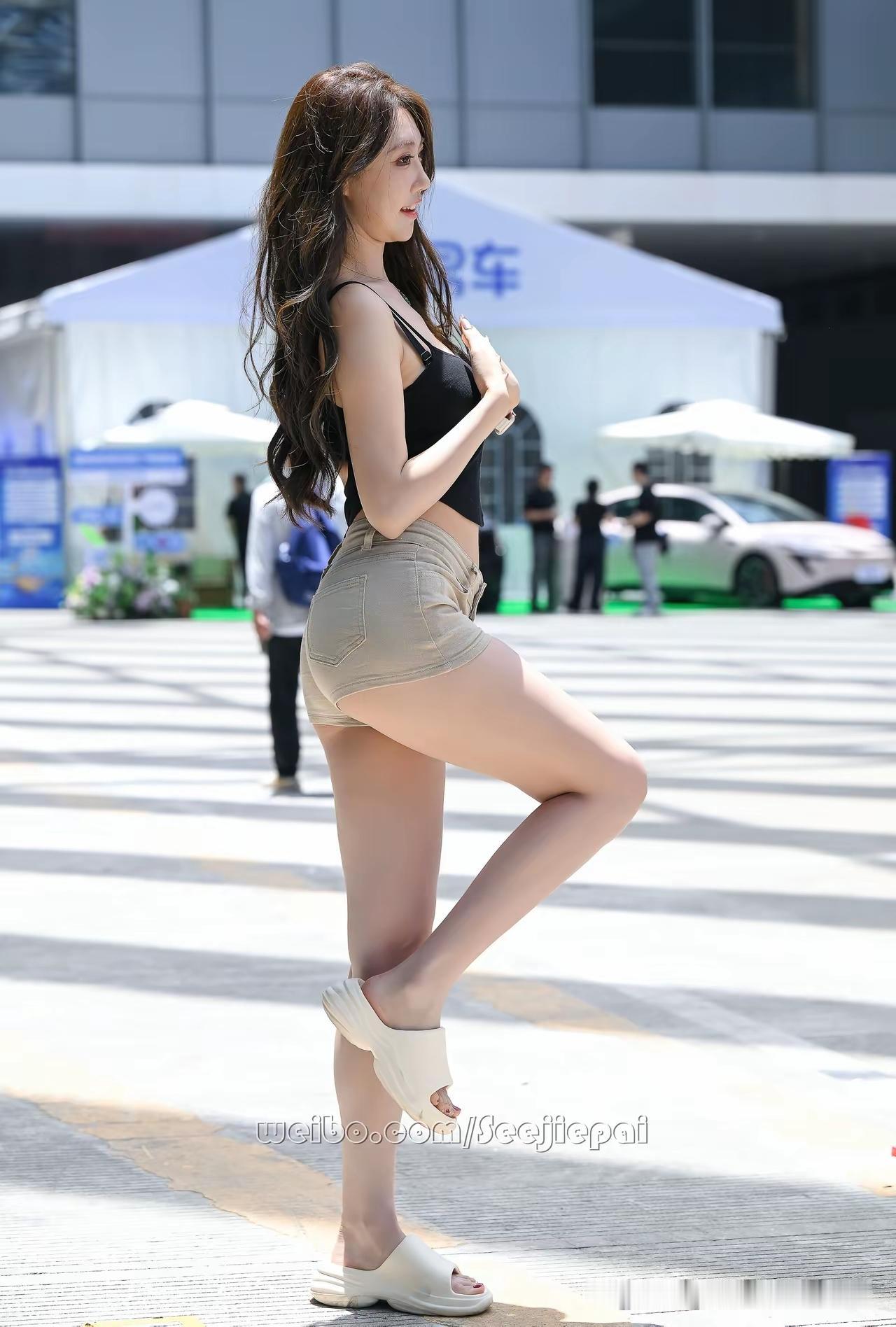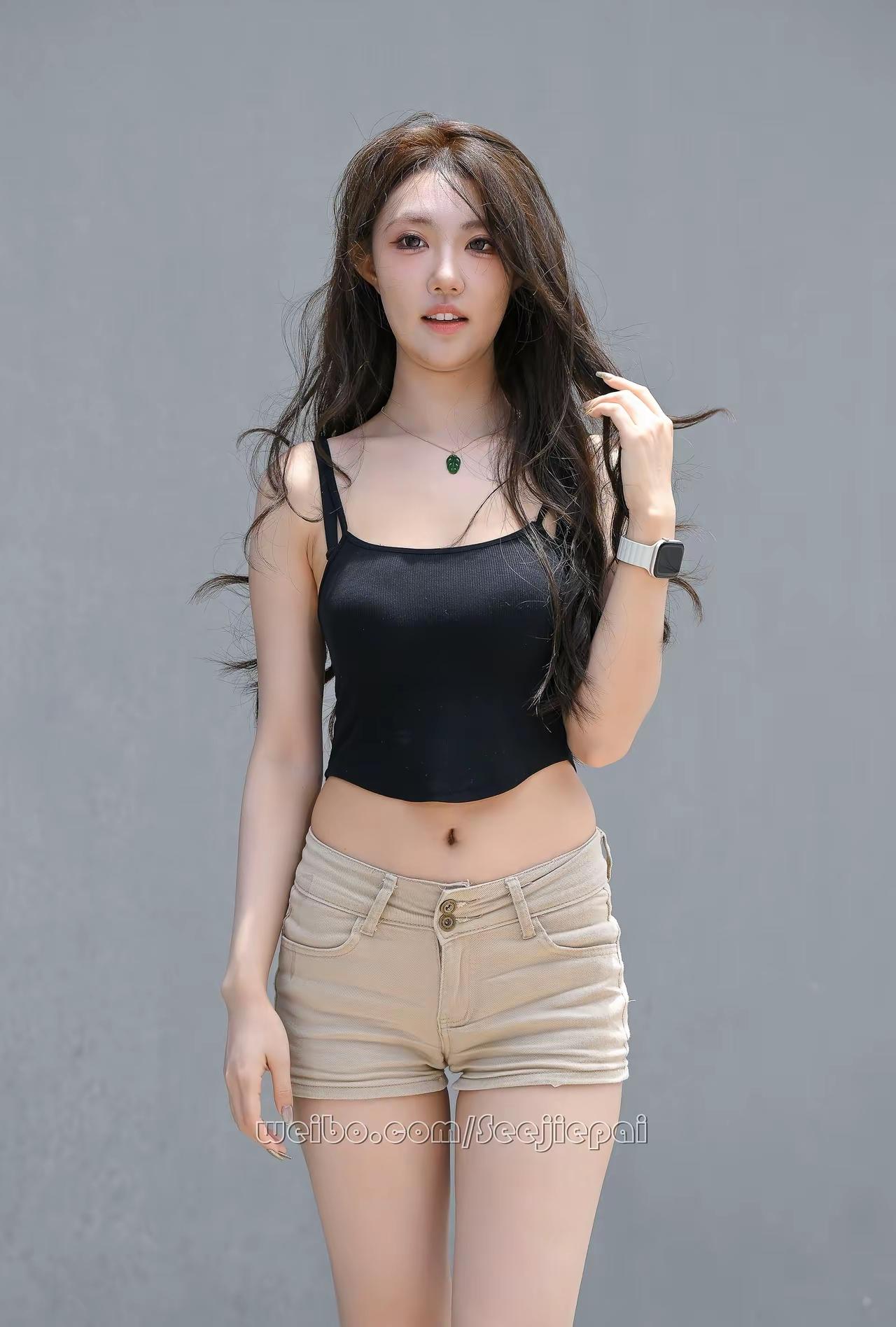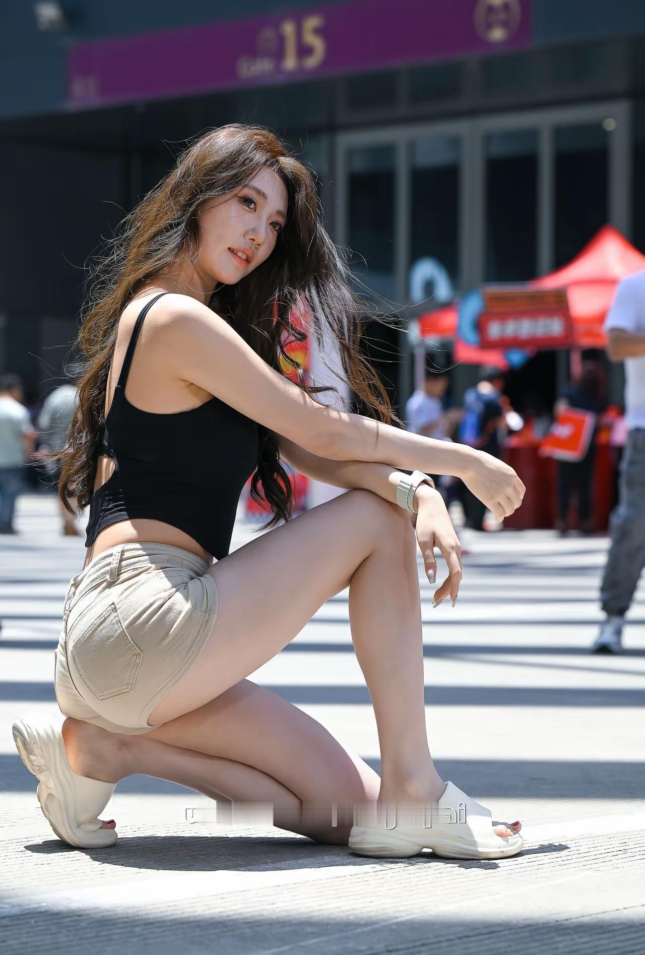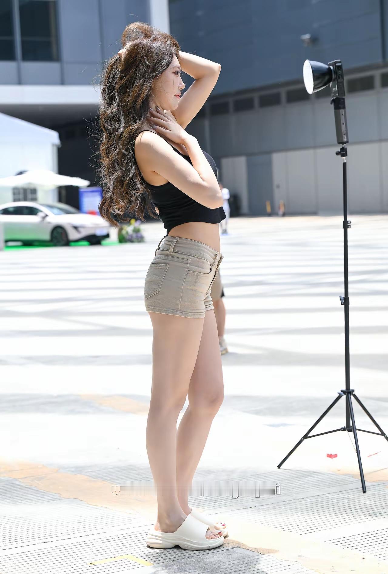 一个长发女孩穿着短裤在户外。微胖的女生怎么穿搭才可以遮肉 超短裤女人