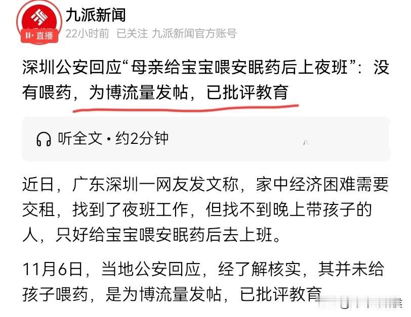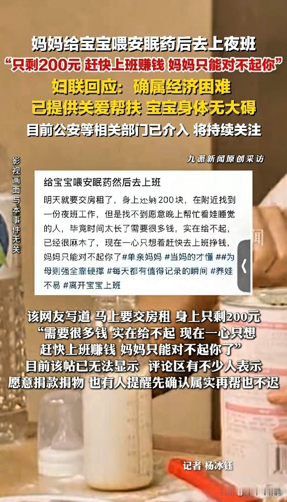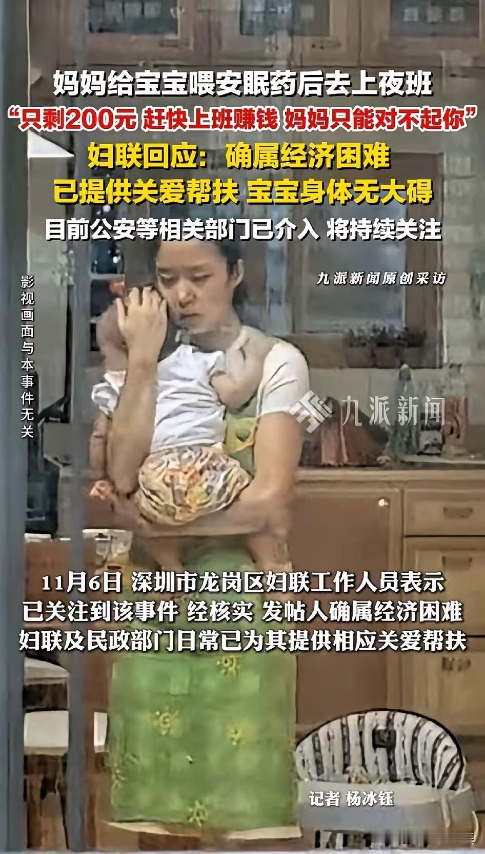 妈妈要上班,无奈给宝宝喂安眠药后续来了,没想是这样的结局,当地警方回应,妇联也有话要说。 近日,有一位深圳网友在网上发帖,内容不长,但表达出来的意思却让人五味杂陈。 大意是这样的: 明天就要交房租了,但妈妈身边只有200元,找人帮带娃肯定付不起,自己找了一份晚上的工作,但担心宝宝夜里醒来找不到妈妈会哭,于是只能委屈孩子了,希望孩子能体会妈妈的苦衷。 一旦提到孩子和单亲妈妈,相信很多网友都会同情,当然也有网友对事件的真实性,提出了质疑。 为此,当地警方行动起来,立马找到了当事人,只是这样的结果,让人觉得多少有点荒唐。 原来,这位单亲妈妈并没有喂孩子药,之所以这样发帖只是为了博取流量,警方了解到具体情况后,现场就对她进行了批评教育。 但当地妇联却给我们带来了另外一个反馈,这位单亲妈妈确实生活困难,如今已经开始了相应的帮扶,而宝宝经过检查,身体无大碍。 当然,这位妈妈有没有喂药,有没有说谎,咱们就不得而知了。 但在这起事件中,还是有几个看点: 比如,孩子的父亲去哪里了?一个人带娃,这个妈妈确实不容易! 比如,单亲妈妈经济窘迫是事实,虽然她发帖想博取同情,但她真实面临的现状却又让人心疼。 比如,庆幸的是,当地妇联立马给她提供了帮助,也算解了她燃眉之急吧。 最后,不知道怎么安慰,只能愿她以后的生活能越来越好吧!