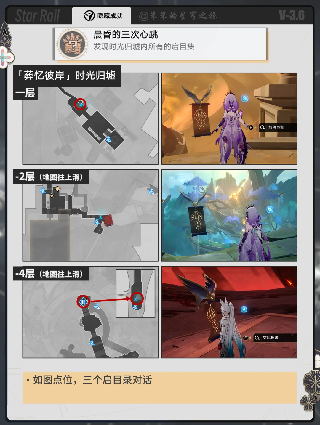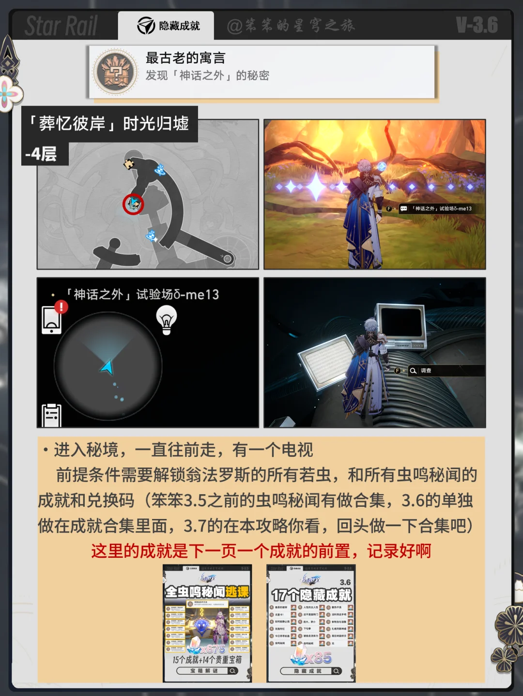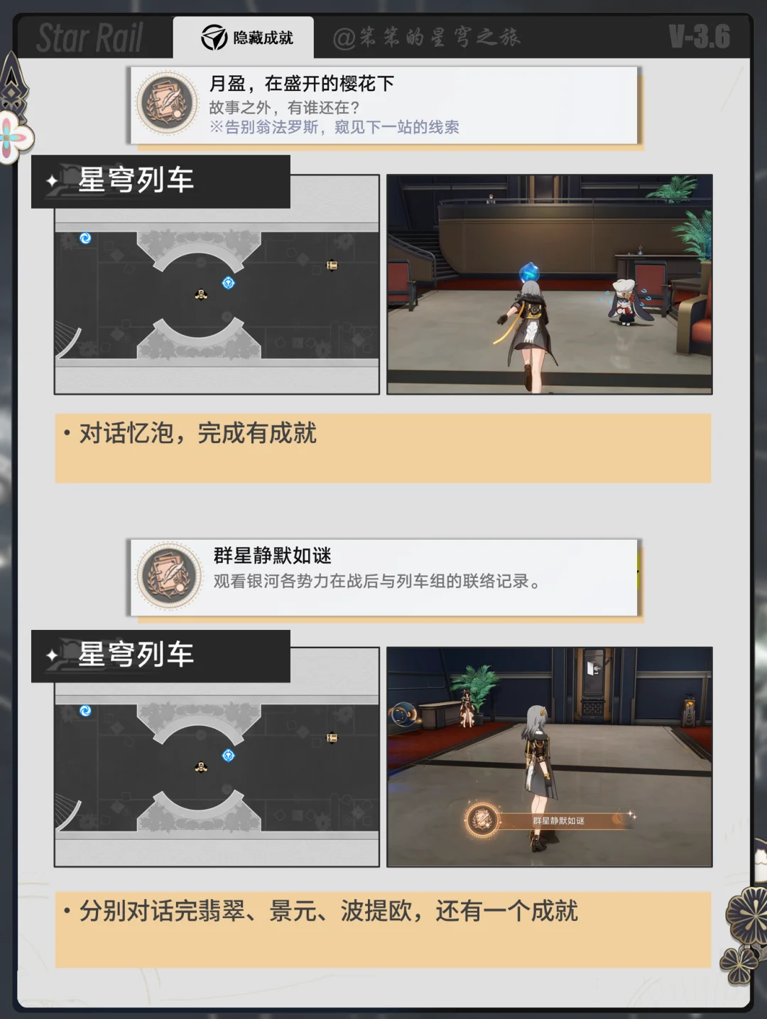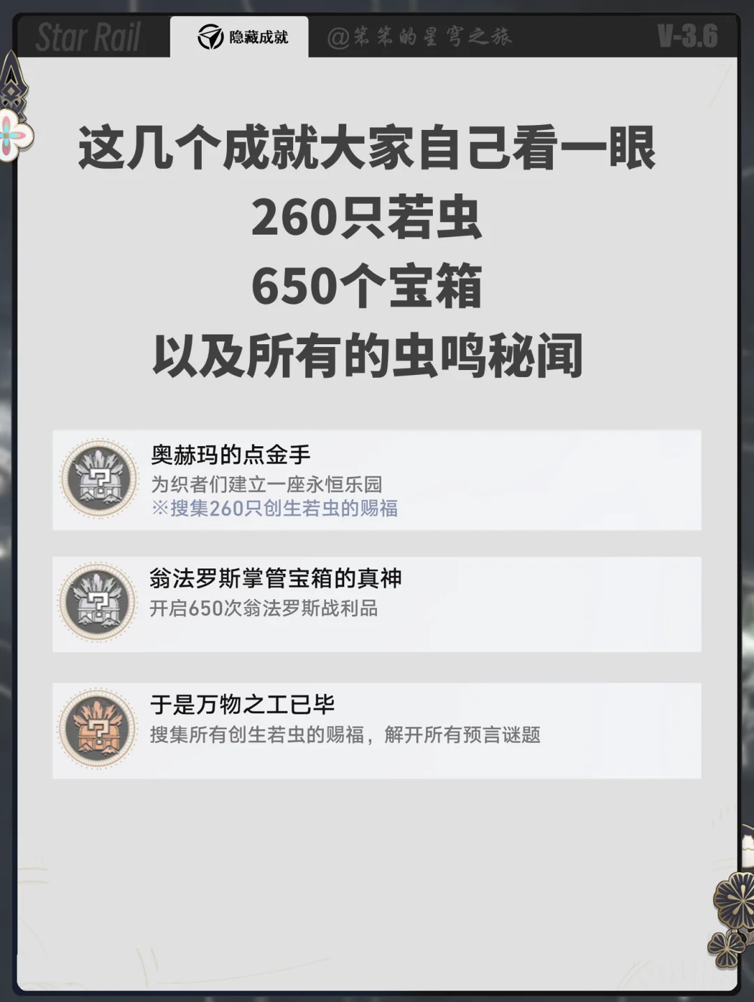 🐱大家好,我是笨笨的铲屎官 今天给大家带来的是3.7隐藏成就 本篇不包含战斗成就和活动成就 然后少了两个隐藏成就 一个是和一页永恒的npc对话 以为npc点位是不固定的 二个是找到所有的家具 这个太复杂,可以单独开一篇 所以就不赘述了,希望对你有用哦