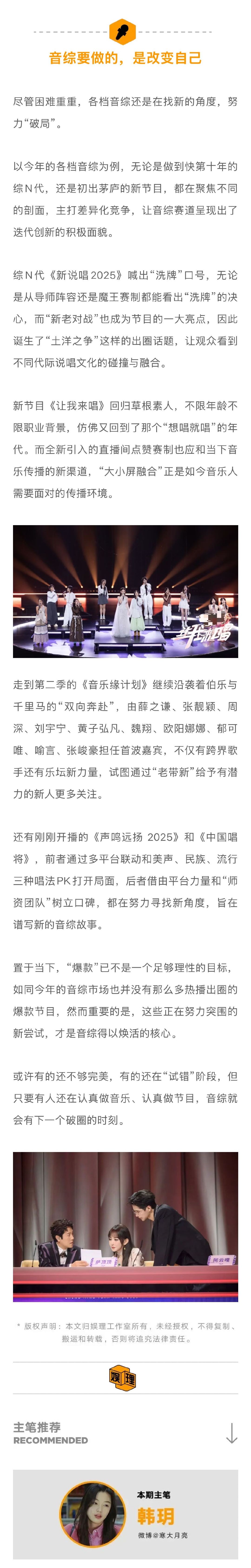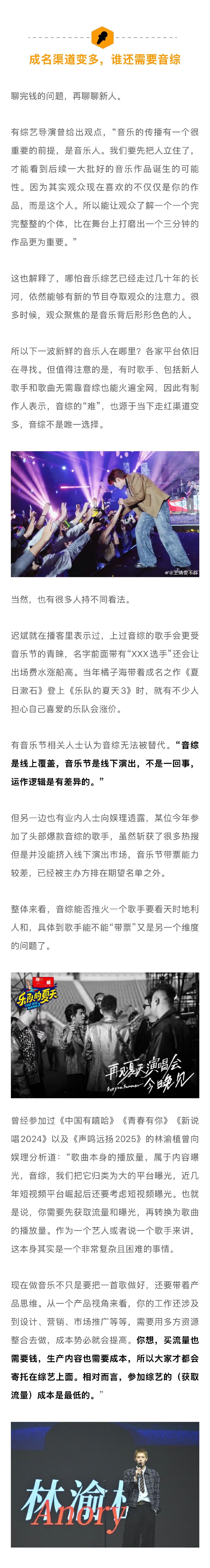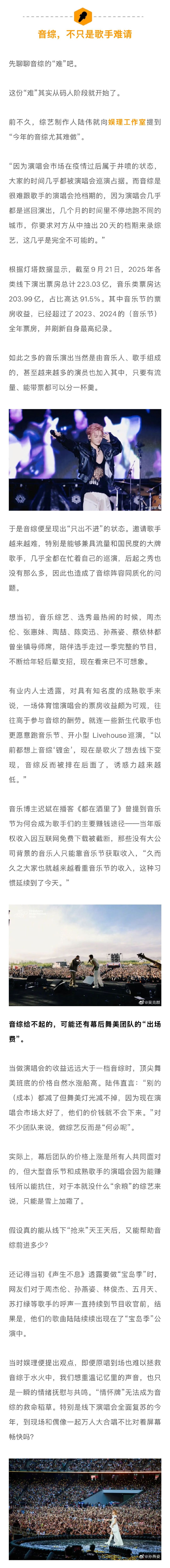 今年的音综会有出圈爆款吗 某爆款音综歌手被音乐节婉拒 除了线下演出市场火爆导致的抢人难,音综给不起的还有幕后舞美团队的“出场费”。综艺制作人陆伟向直言:“别的(成本)都减了但舞美灯光减不掉,因为现在演唱会市场太好了,他们的价钱就不会下来。”幕后团队的价格上涨是所有人共同面对的,但大型音乐节和成熟歌手的演唱会因为能赚钱所以能抗住,对于本就没什么“余粮”的综艺来说,只能是雪上加霜了…娱理独家↓