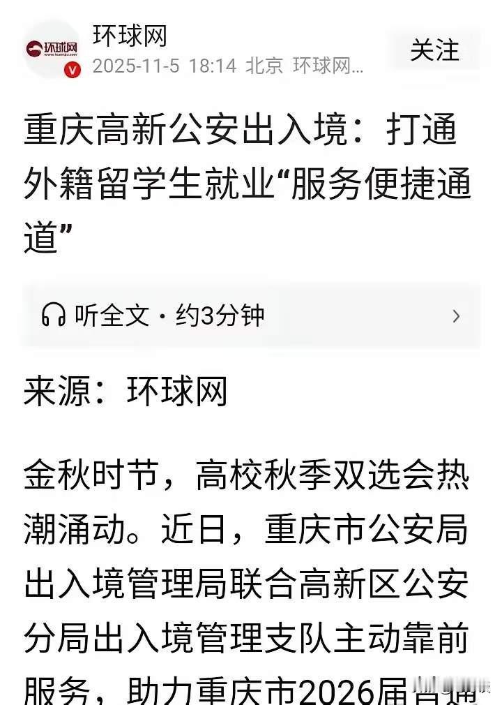 重庆公安打通了外籍留学生在重庆就业的快捷通道,让这些外籍留学生在重庆落地生根,为重庆的快速发展提供智力支持,这也为我国吸引外籍人才提供了良好的渠道。作为全球村的一部分,我们可以走出去,同时也可以吸引外来人才,为我们的发展助攻。 重庆公安的做法让更多优秀的人才留在重庆,留在中国,为我们的发展提供了很大的便利。与此同时,应当做好保障国内毕业生的就业帮助,让国内毕业生能够找到称心如意的工作,助力国家的发展,毕竟国家的发展最主要的驱动力还是来自于本国的毕业生。