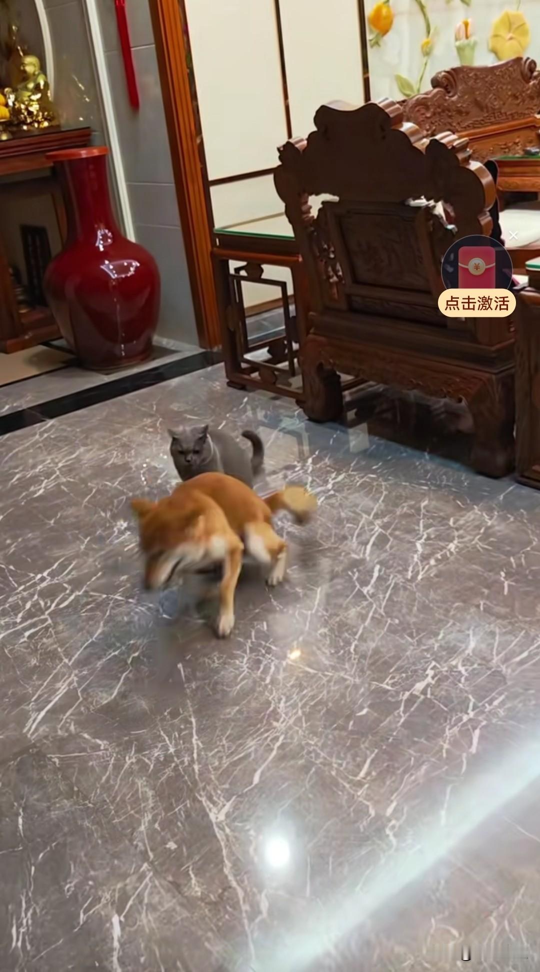 狗狗觉得猫咪身形小,好欺负,便气势汹汹地走到它跟前。猫咪却镇定自若,运筹帷幄地等
