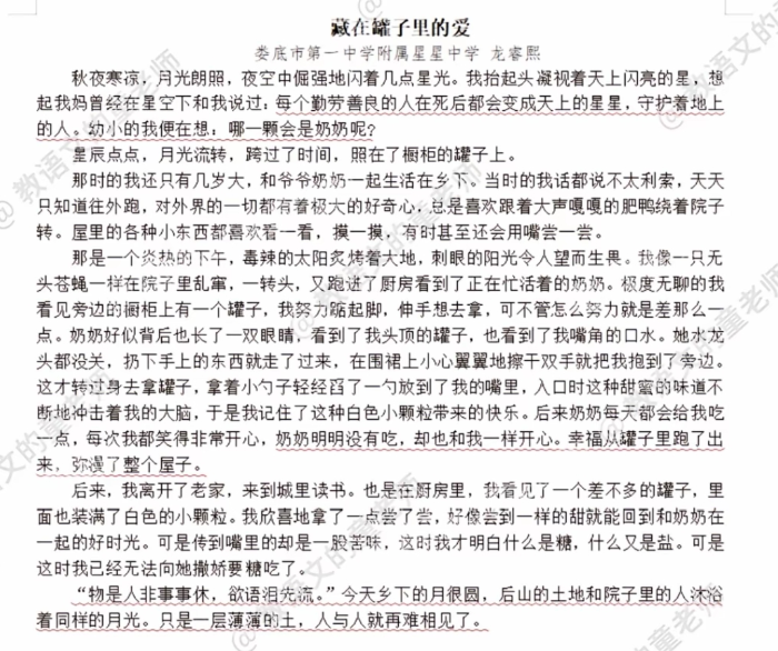 童老师在视频里还读了作文中两句写得很好的句子,“奶奶明明没吃,却也和我一样的开心。幸福从罐子里跑了出来,弥漫了整个屋子。”“‘物是人非事事休,欲语泪先流。’今天乡下的月很圆,后山的土地和院子里的人都沐浴着同样的月亮,只是一层薄薄的土,人与人就再难相见了。”