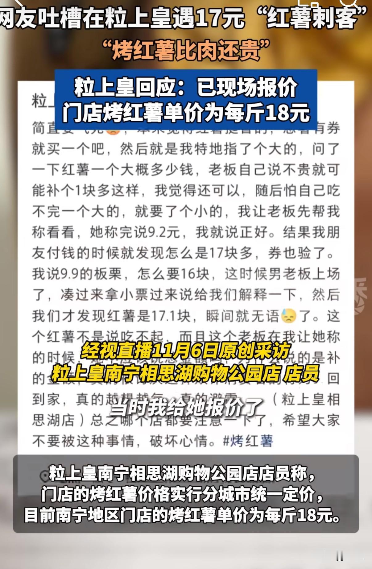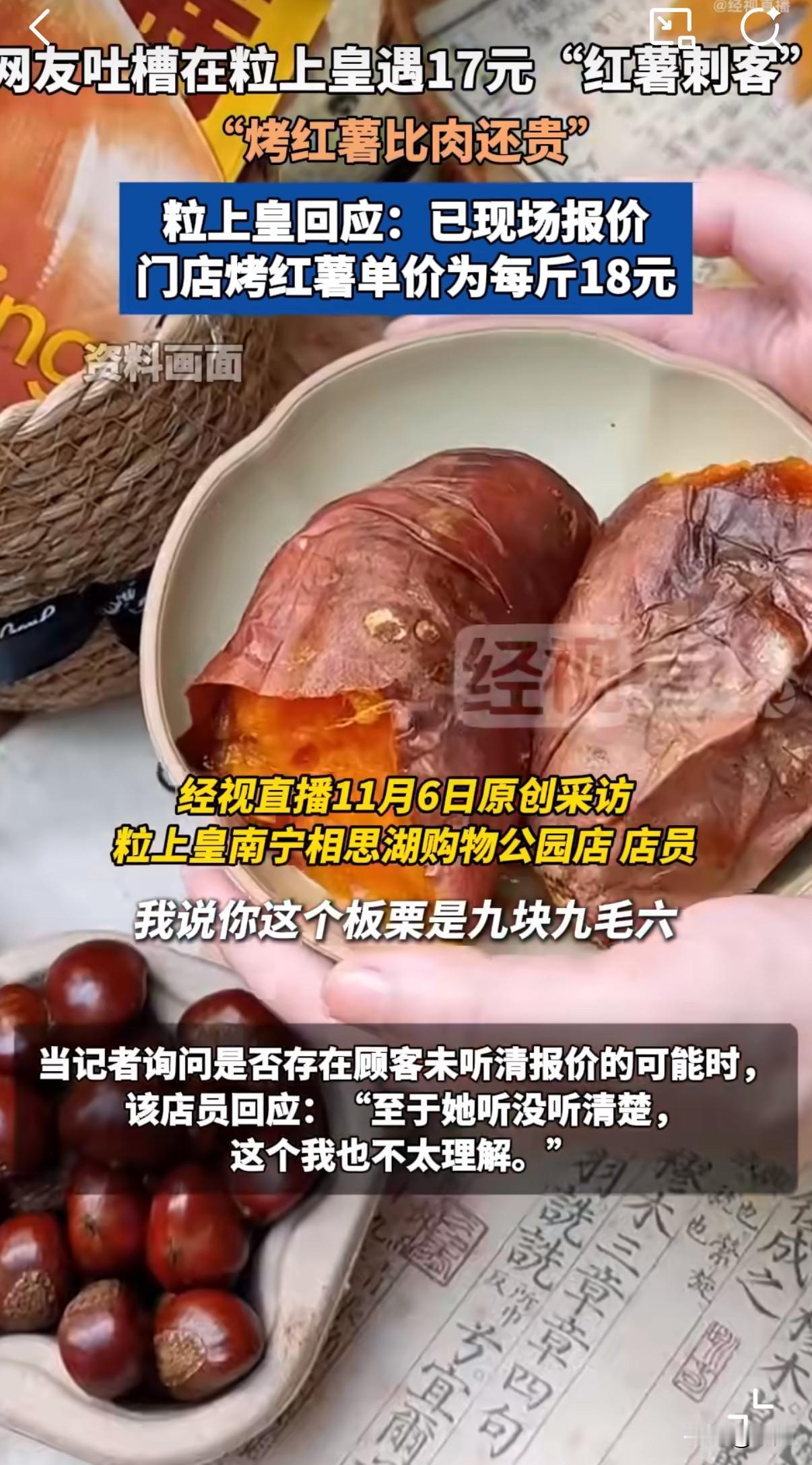 一个烤红薯要17块?现在买个红薯都得先问价了,不然结账时心慌慌。 事情发生在粒上皇南宁的一家门店。有位姑娘去买板栗和烤红薯,特意挑了个看起来不算太大的红薯。她挺谨慎,还跟店员说:“先帮我称称看多少钱。” 店员称完告诉她:“9块2。”姑娘觉得价格合适,就决定买了。 结果朋友用优惠券付款时,她瞄了一眼账单,愣住了——怎么要17块多?这时候另一位店员拿着小票过来解释,她才明白,那个不起眼的烤红薯居然要17.1元。 姑娘后来在网上说:“不是吃不起,就是觉得老板称重时应该把总金额说清楚。” 事情闹大后,记者去采访了这家店。店员确认确有此事,还调了监控。他们解释:“当时我跟她说了,板栗9块9毛6,红薯17块。”至于顾客听没听清,店员表示这就不清楚了。 关于价格,粒上皇方面说他们是分城市统一定价。南宁的烤红薯卖18元一斤,小的十一二元,大的十五六元,还有更贵的。“我们广西还算便宜的,深圳、广东那边更贵。” 这事在网上炸开了锅。网友们纷纷表示:“这也太贵了!”“现在烤红薯都成奢侈品了?” 其实细想,问题不在红薯该卖多少钱,而在消费过程要明明白白。要是称重时店员把总价说清楚,或者价签更醒目些,可能就没这误会了。 现在很多传统零食店都在走“网红”路线,装修越来越精致,价格也跟着水涨船高。但再怎么样,诚信经营、明码标价这个根本不能丢。 作为消费者,咱们以后买没标价的东西,还是多问一句价格。免得结账时被吓一跳,那得多影响心情啊。 这事说到底就是个沟通和透明度的例子。商家明码标价,顾客问清价格,双方都清清楚楚,这样的买卖才做得长久。