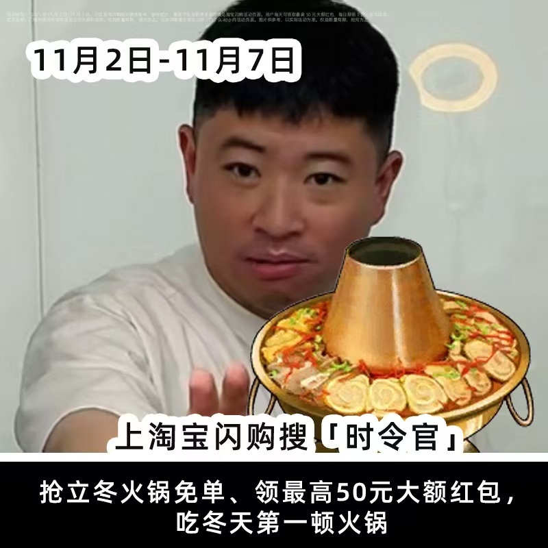 立冬后雨雨雨雪雪雪冬天的仪式感不是围巾,是围着火锅坐一圈。11 月 2 日 - 11 月 7 日上淘宝闪购搜「时令官」,抢立冬火锅免单、领最高 50 元大额红包,吃冬天第一顿火锅。吃第一锅火锅的时候,寒冷就自动退出群聊了。 跟杨雨光抢淘宝闪购立冬火锅免单立冬上淘宝闪购吃火锅