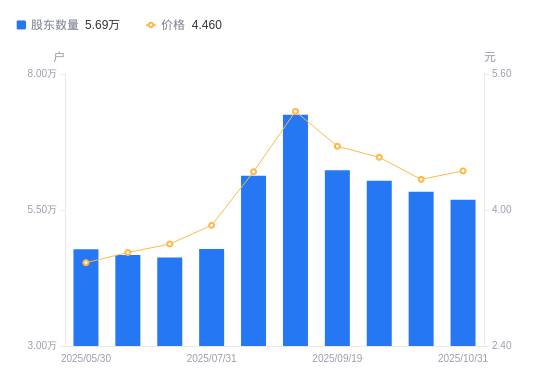日期A股户数(户)流通A股户均持股数(股)户均持股市值(万元)2025-10-205833632638.9114.232025-09-306039331527.2214.572025-09-196232430549.9214.512025-08-207251126257.9913.552025-08-086129831061.2613.822025-07-314784539795.0315.202025-07-184629141130.9614.812025-06-304670540766.3714.272025-05-304779439837.5013.472025-05-094822639480.6414.17