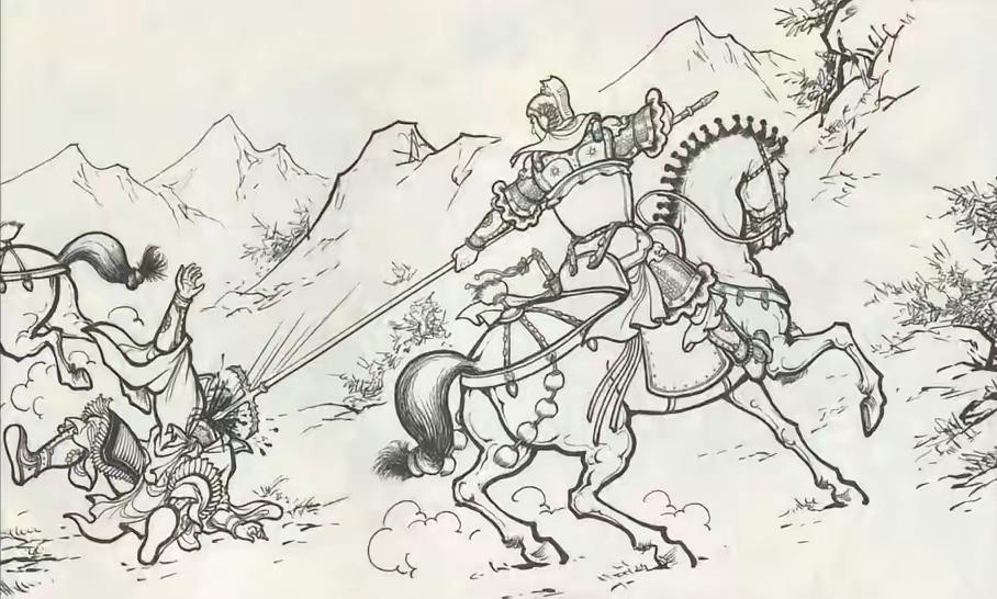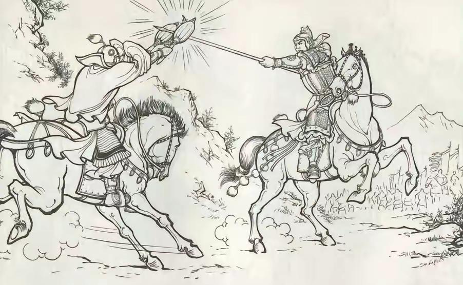 越王杨素和天宝将兵伐南阵,正遇刘天孝大军。天宝将一提马的丝缰来到阵前。 刘天孝手下大将张冲举三停大砍刀直奔天宝将面门。天宝将举凤翅鎏金镋向外一推,顺势把镋向下一压,向张冲斜扫下来,张冲急忙闪身躲过。二马错镫,天宝将轻舒猿臂将张冲走马活擒。 李度一看好友被擒,急忙上前来救,天宝将迎着李度将张冲扔出去,李度出于本能举单锤去迎,正砸在张冲头上,张冲当即死去。李度大怒,双锤叠加砸向天宝将,天宝将举镋相迎,“当啷”一声,李度险些大锤脱手。 二人圈回马来二次交锋,打了七八个
