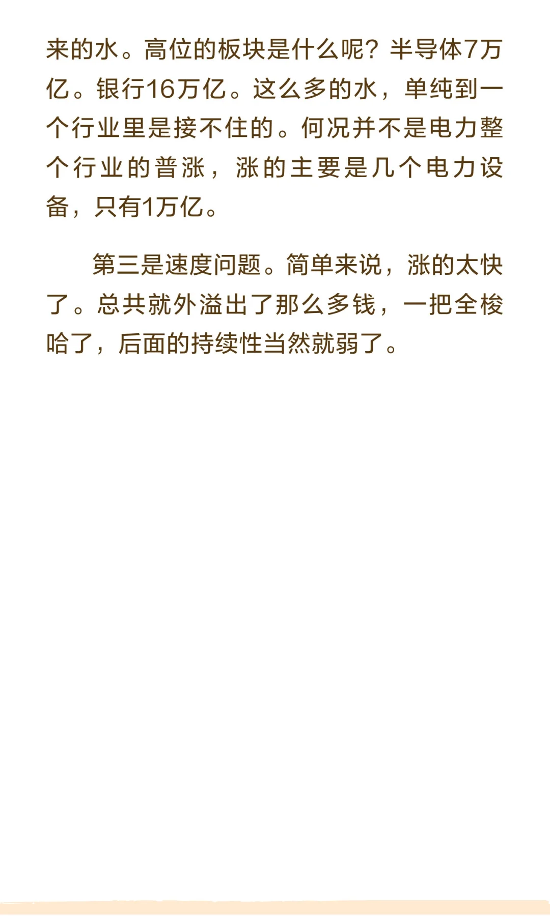 第三是速度问题。简单来说,涨的太快了。总共就外溢出了那么多钱,一把全梭哈了,后面的持续性当然就弱了。