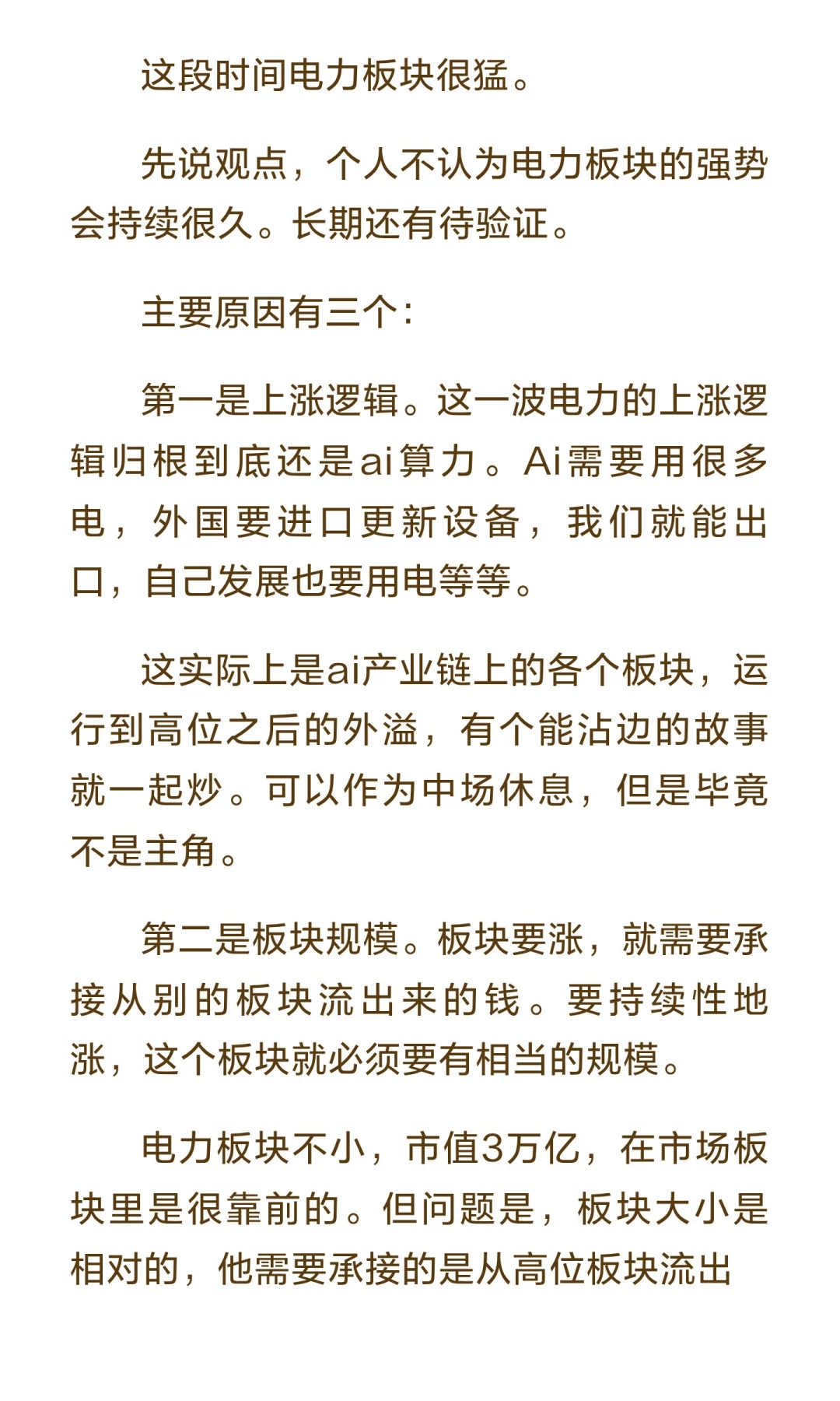 第一是上涨逻辑。这一波电力的上涨逻辑归根到底还是ai算力。Ai需要用很多电,外国要进口更新设备,我们就能出口,自己发展也要用电等等。