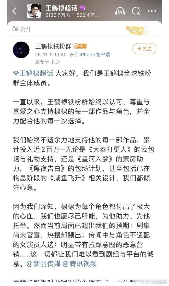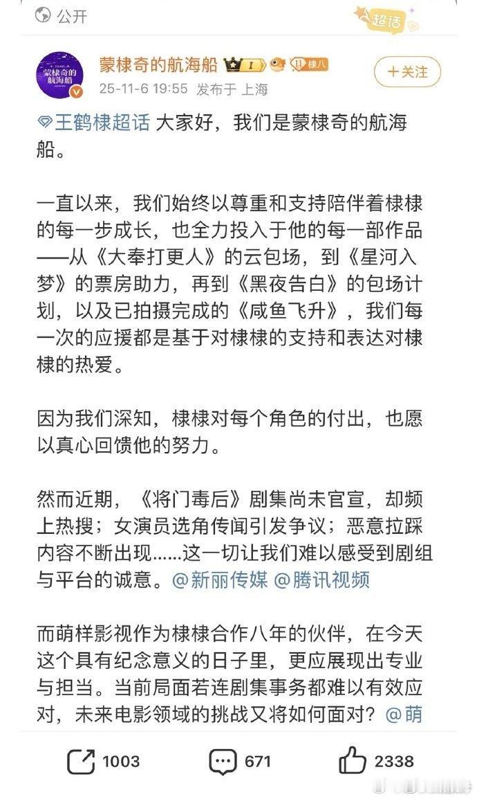 11月8日,《将门毒后》这个饼,孟子义先扔了,看到王鹤棣粉丝喊话小花来争女主,说