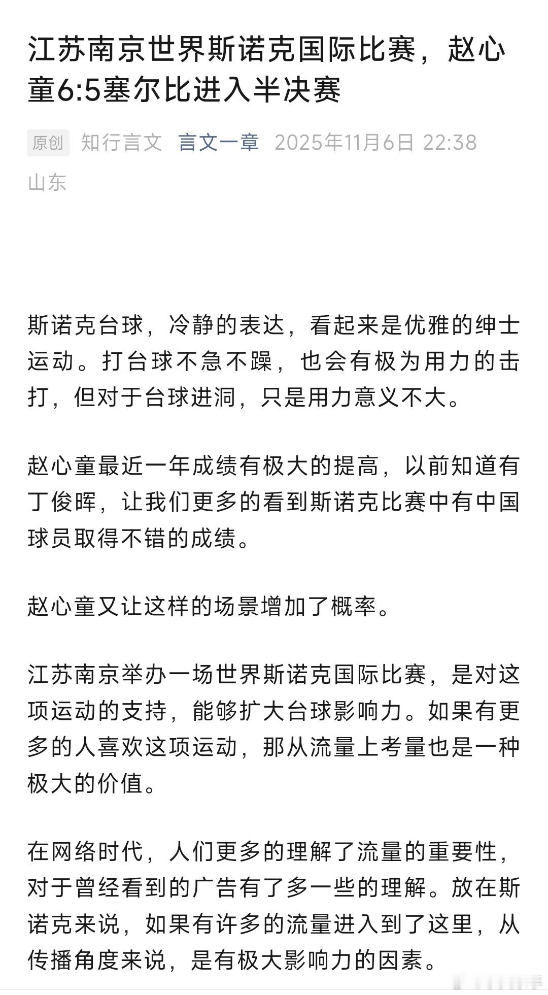 江苏南京举办一场世界斯诺克国际比赛,是对这项运动的支持,能够扩大台球影响力。如果有更多的人喜欢这项运动,那从流量上考量也是一种极大的价值。