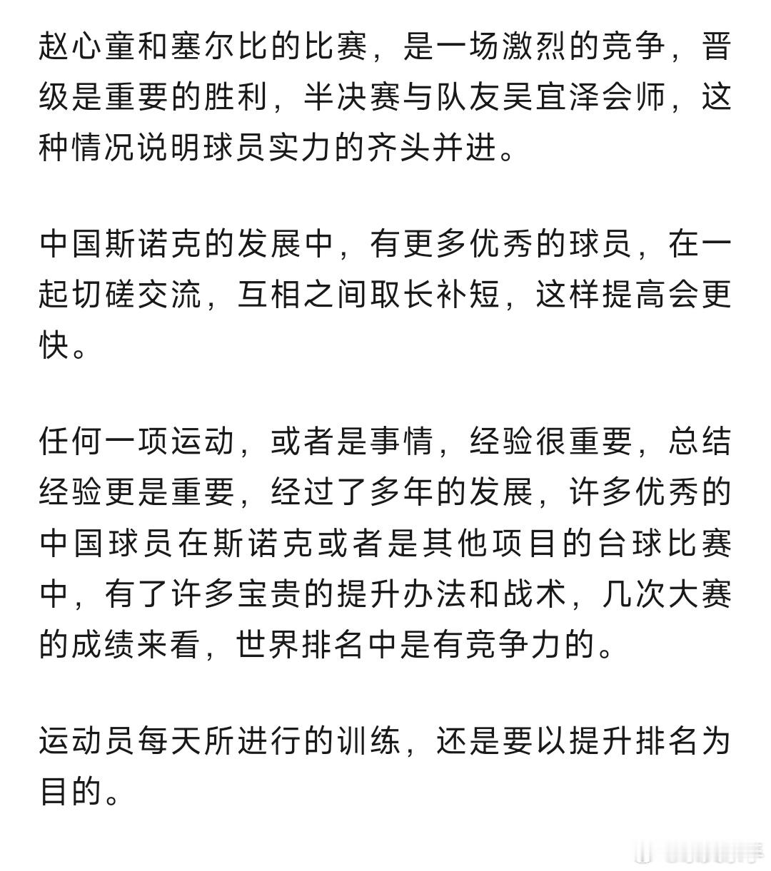 赵心童和塞尔比的比赛,是一场激烈的竞争,晋级是重要的胜利,半决赛与队友吴宜泽会师,这种情况说明球员实力的齐头并进。