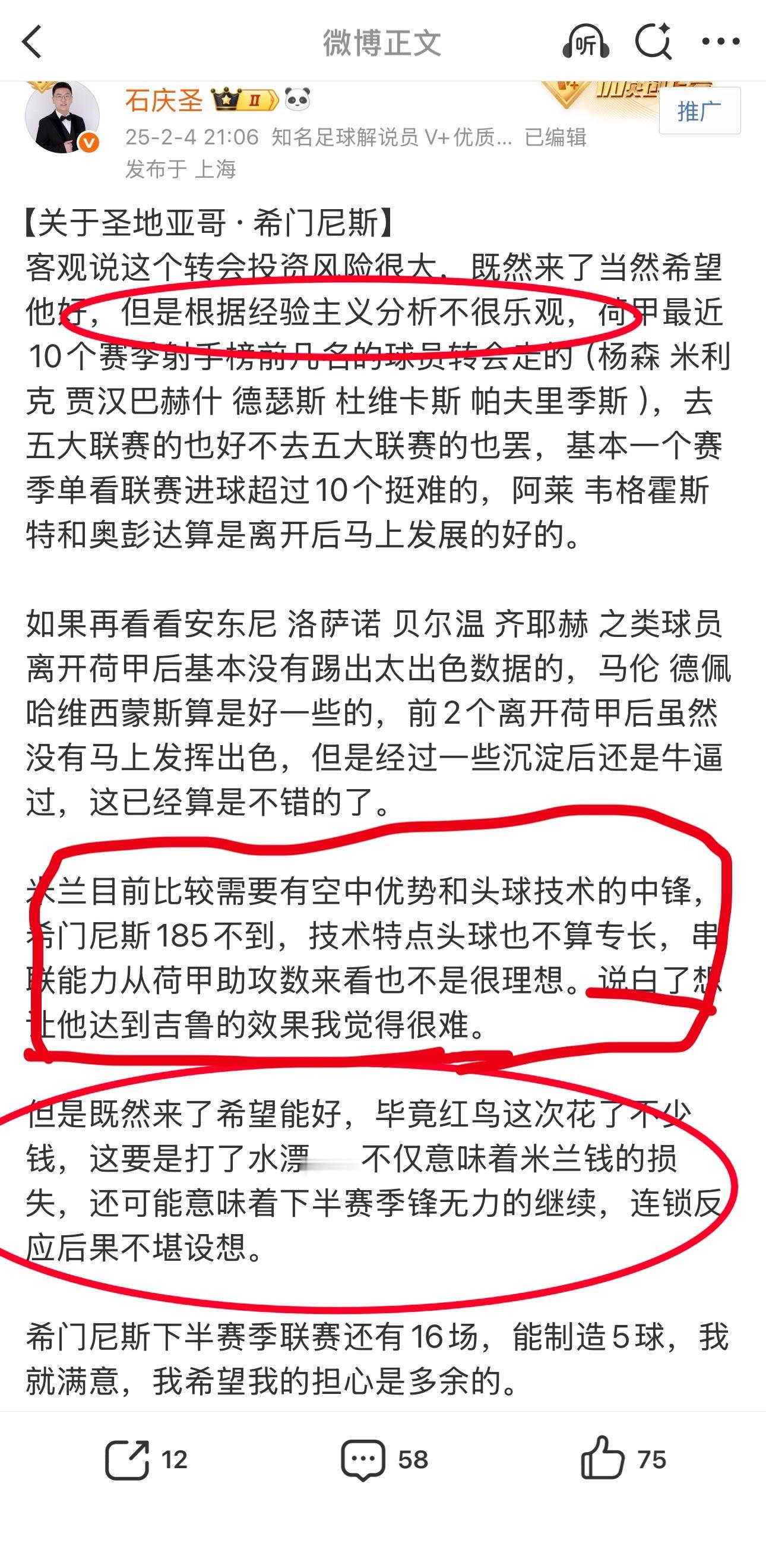 最后我想说,圣地亚哥是我从刚来就说“不乐观”的,赛季初我说“指望他打主力,前四进不去”,因为我非常了解最近15年荷甲锋线数据含金量,我当时发微博了都能证明,我知道有些xx不愿意看到我观点前瞻性牛逼,就一个劲儿“无脑护”,你们不是包容大西门,你们是希望“打脸我”。我现在不怕打脸,可以告诉你们,圣地亚哥的米兰生涯我认为倒计时了,快的话冬天,慢的话夏天。