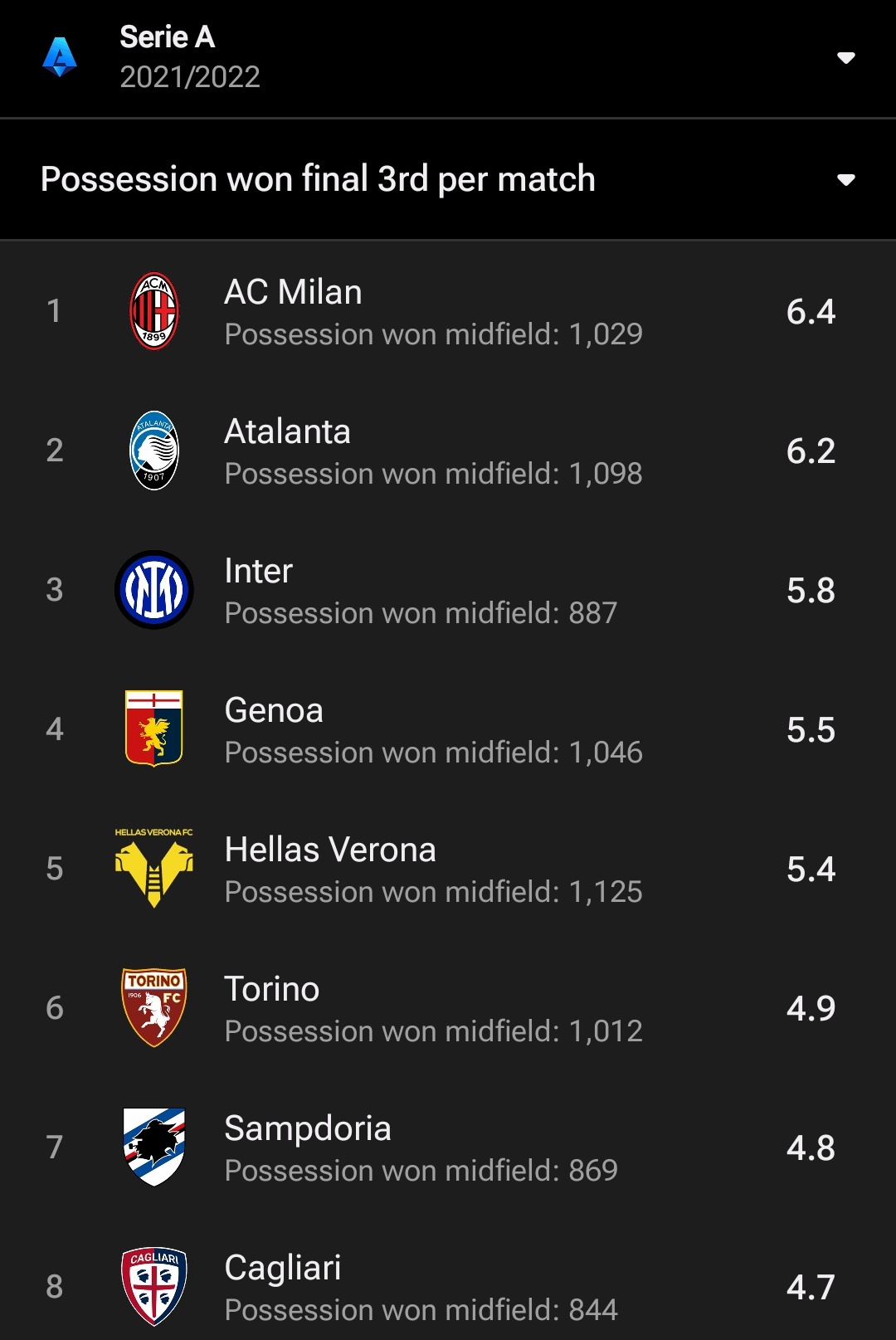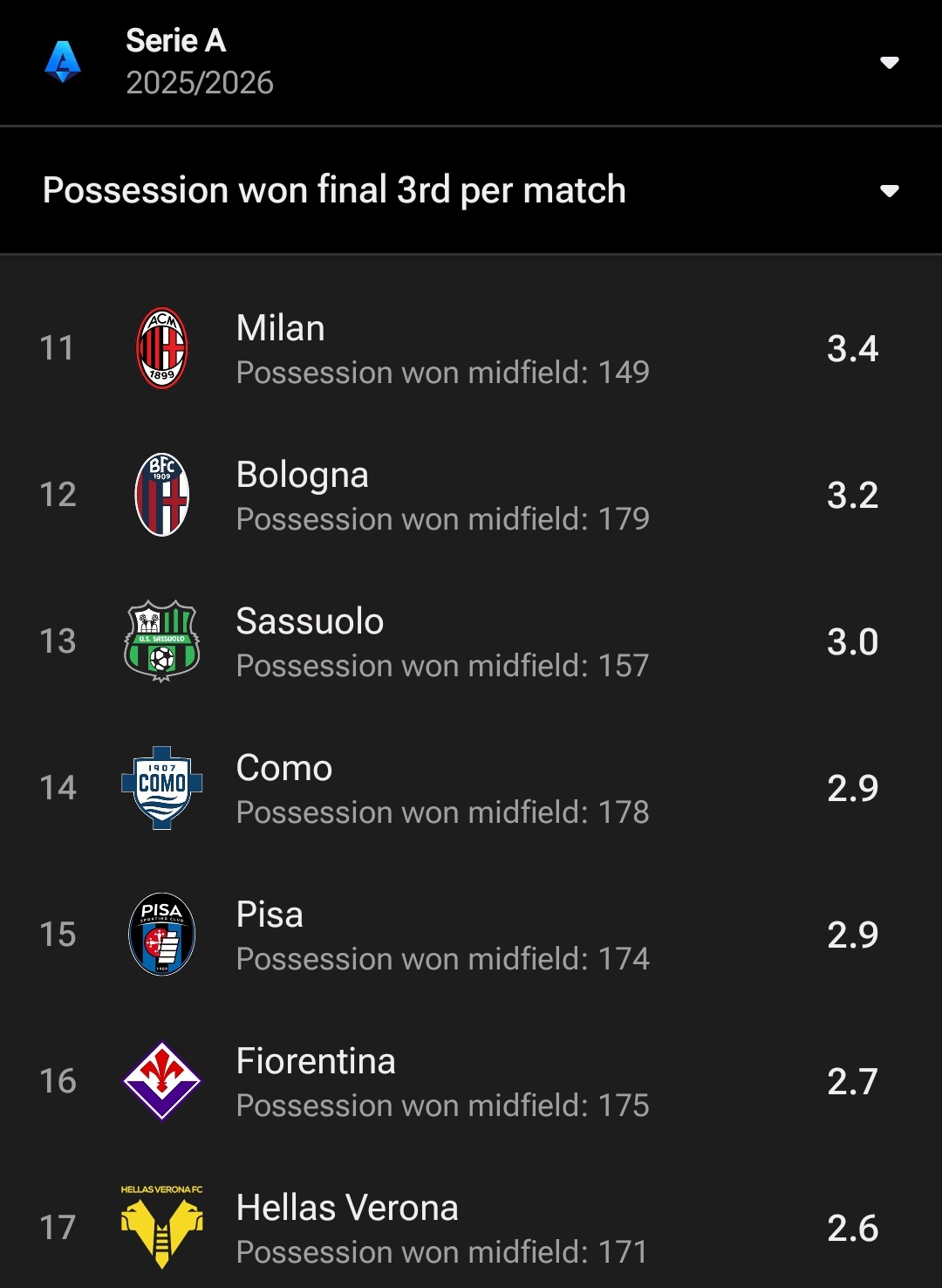 而现在呢?米兰在这项数据(对手防守三区控球率)上排第11位,这清晰体现了阿莱格里的球队的风格——前场的压迫最少,更依赖紧凑、更深的防守,会主动在对方半场让出空间,通过引诱对手施压,在更深的区域断球后打反击。