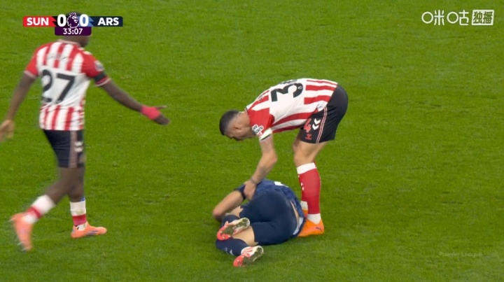 不满!桑德兰进球前,扎卡放倒反击中的梅里诺,对其贴脸怒喷