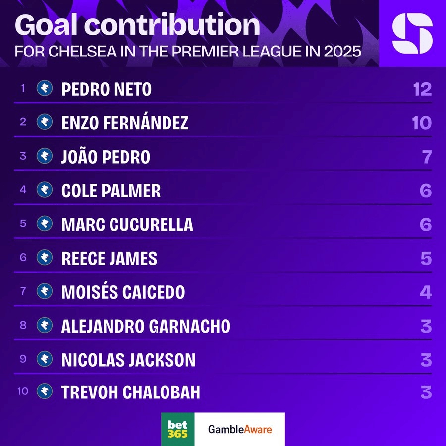 佩德罗-内托是2025年唯一英超进球、助攻皆5+的切尔西球员
