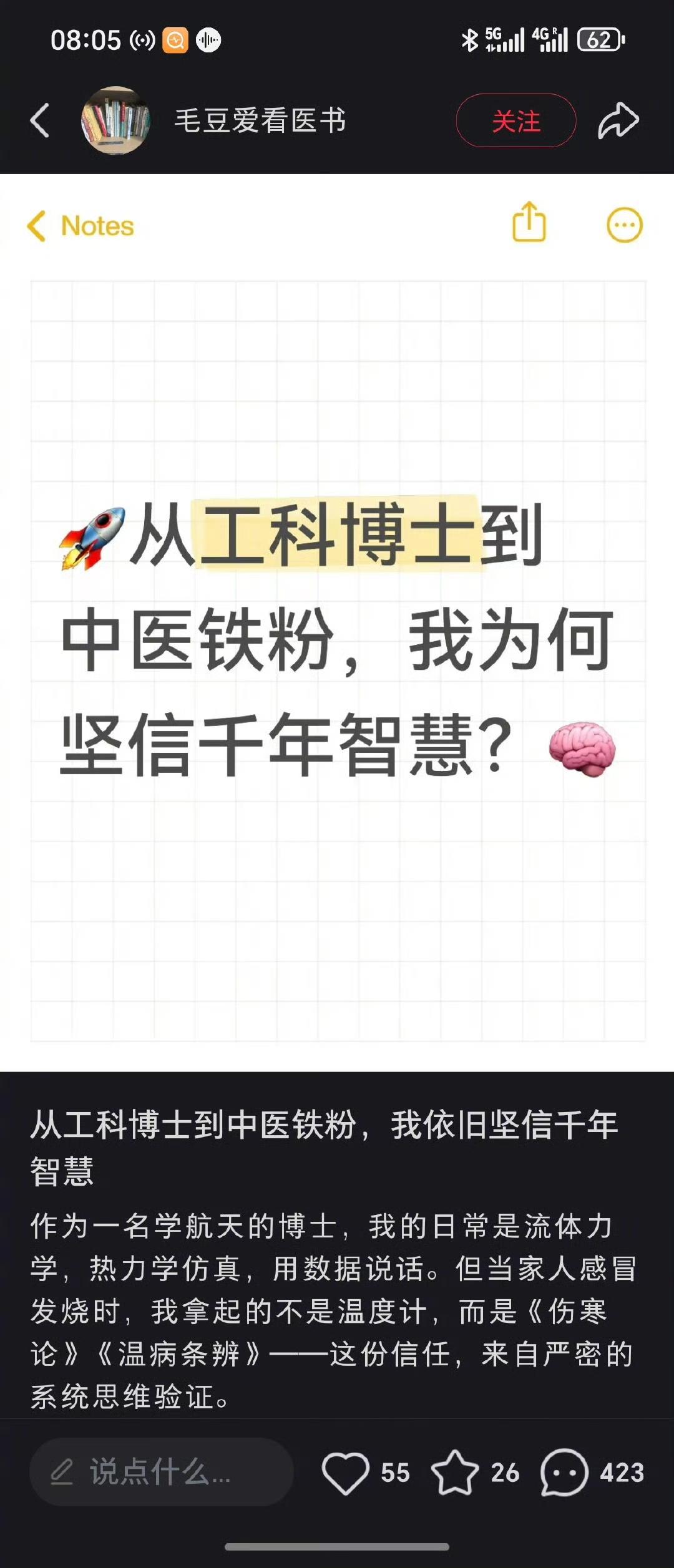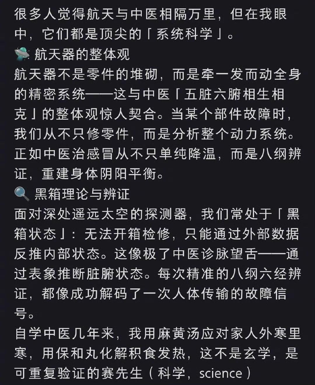 陈震:[震惊] 有时候感觉中医还是挺好的,比如说针灸以及其他的辅助治疗手段,确实比西医直接吃药有效的多。 但是中医学精的人没有几个,而且中医还有一个东西没有办法解决,就是很多病如何治愈的机理没有太明白,比如说人得了伤寒,那吃有些中药确实有作用,但是为什么吃这个有作用缺乏系统性阐述。 有些人的想法太狭隘了,认为中医都是错误的,或者说认为中医全都是对的,就和认识一个人一样,没有办法全面的认识。