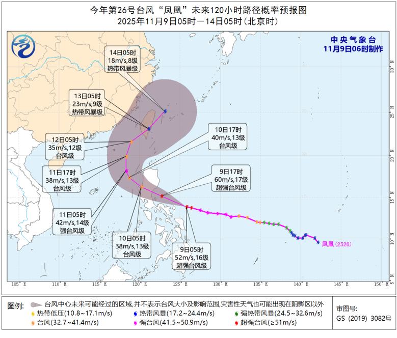 预计,“凤凰”将以每小时30公里左右的速度向西偏北方向移动,强度还将有所增强,最强可达超强台风级(55-62米/秒,16级-17级以上),9日夜间在菲律宾吕宋岛东部沿海登陆,穿过吕宋岛后强度明显减弱,将于10日中午前后移入南海东部海面,强度略有增强,11日开始逐渐转向北偏东方向移动,趋向台湾岛西南部沿海,强度迅速减弱。