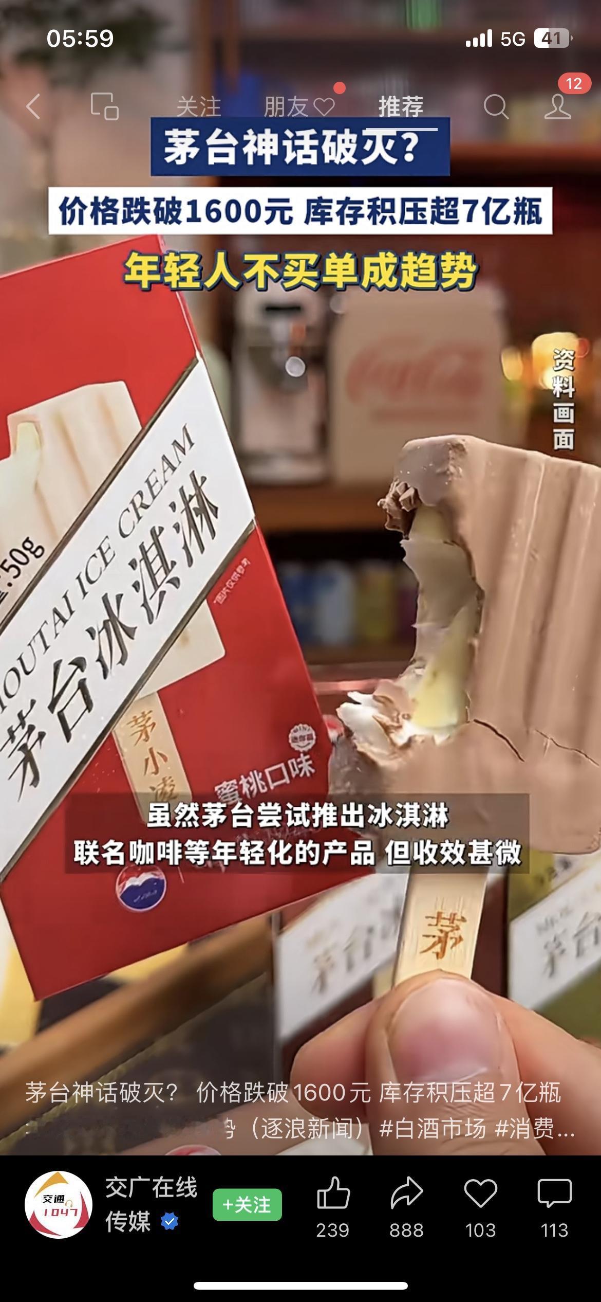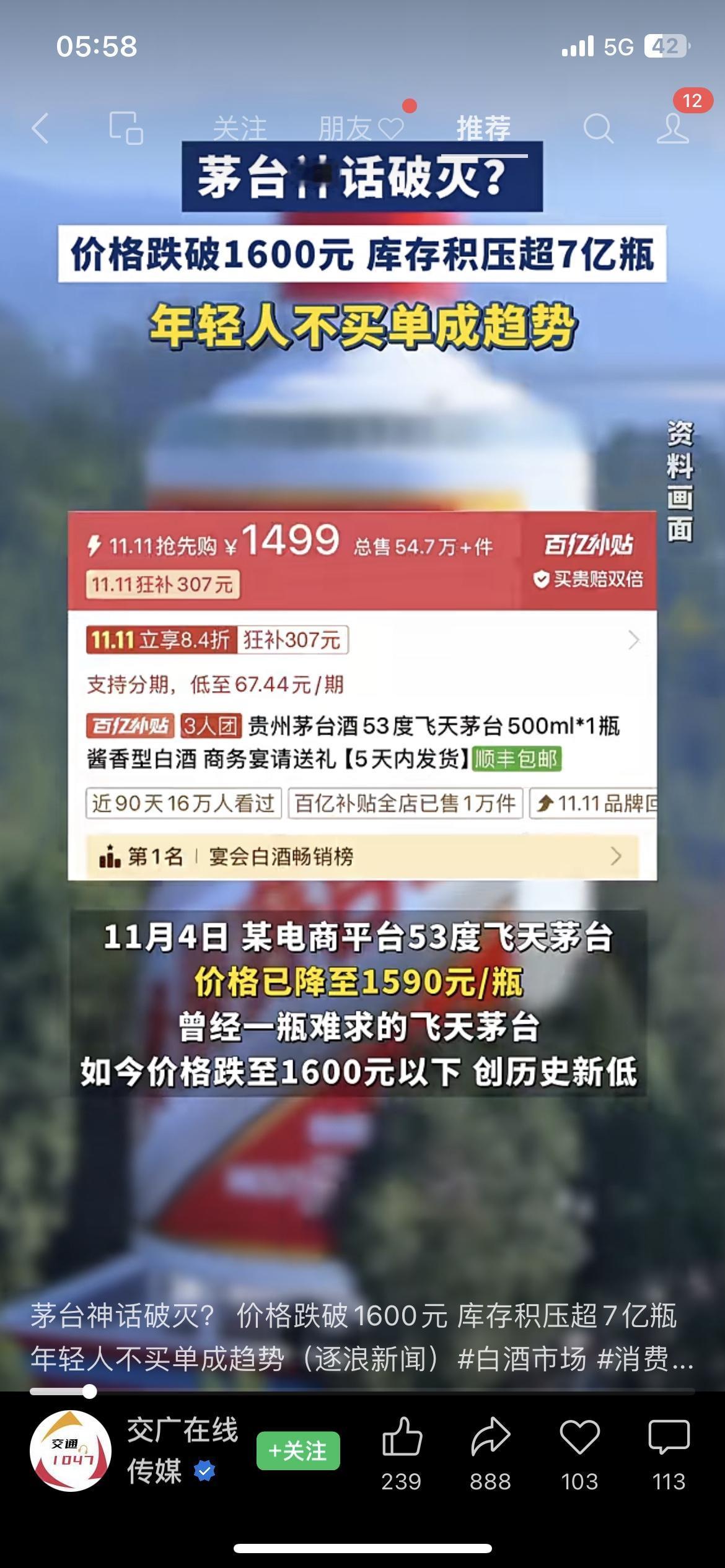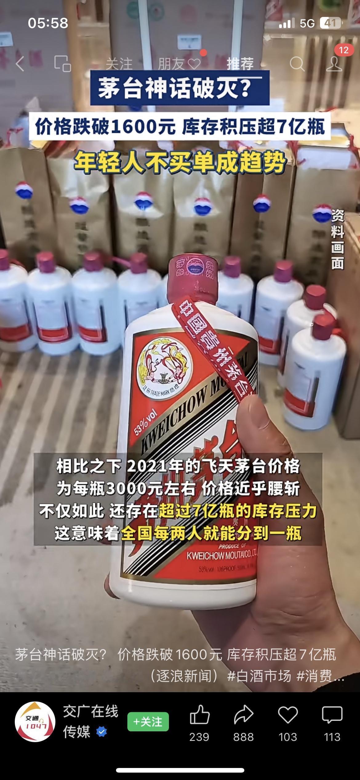 茅台价格腰斩+7亿库存 茅台这次是真‘崩’了! 2021年抢破头的飞天茅台,当时炒到3000一瓶,现在电商直接卖1590——价格砍半就算了,库存还堆了7亿瓶!相当于全中国每2个人分一瓶,喝到下辈子都喝不完。 年轻人现在聚会喝奶茶、蹦迪喝气泡酒,谁还凑那‘茅台局’啊?这‘酒圈顶流’,是不是真要凉透了?茅台价格暴跌 你家还有囤的茅台吗?”茅台 茅台酒价格波动 茅台行情