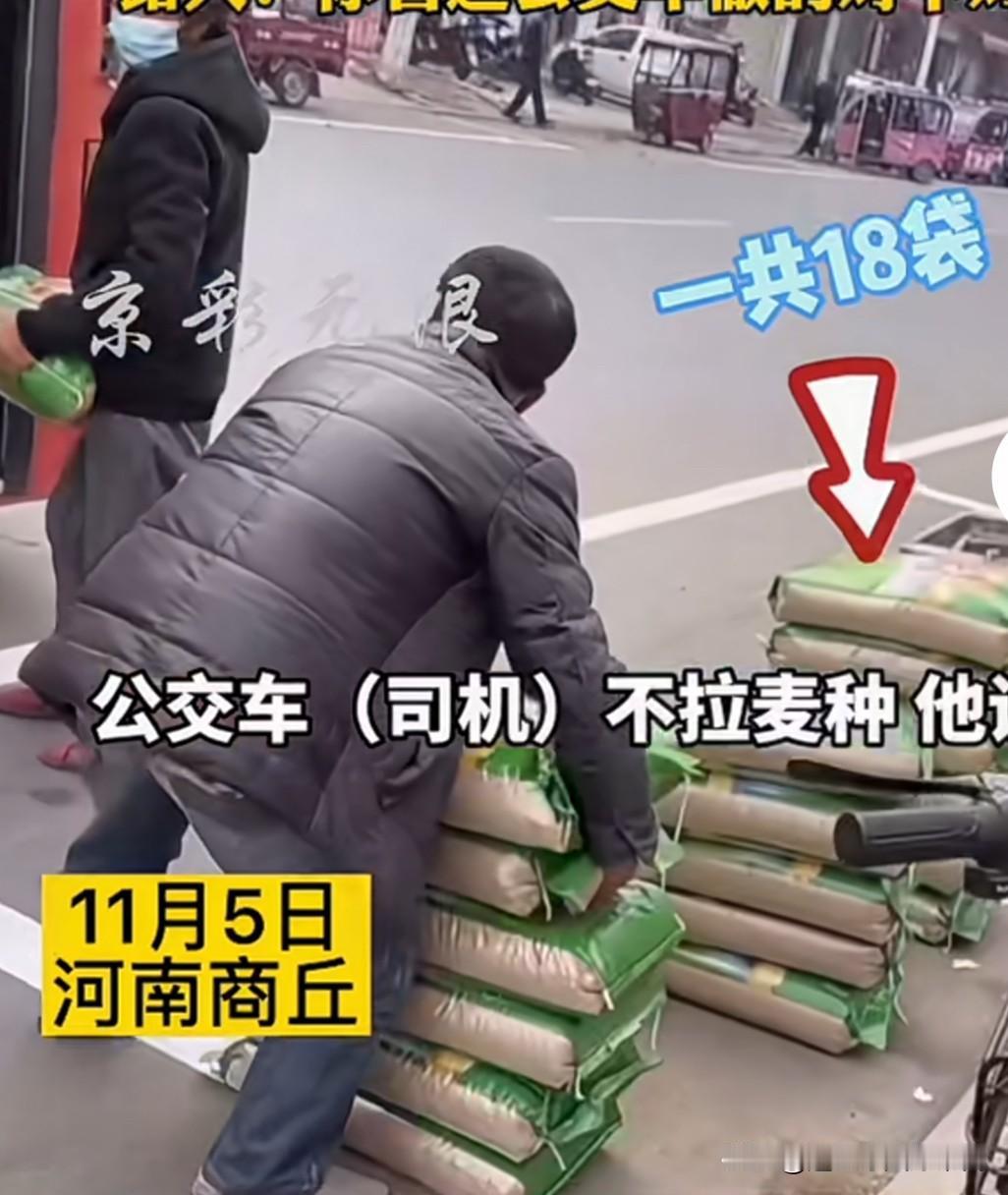 公交车司机拒载 农民大哥买了18袋麦子种子,但是他没有要求种子店送货到家,而是要