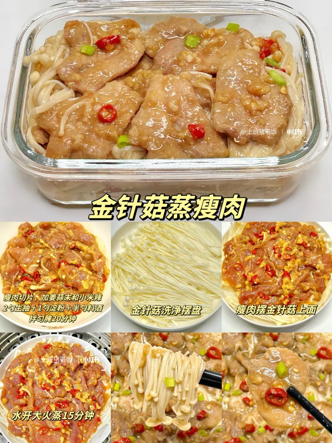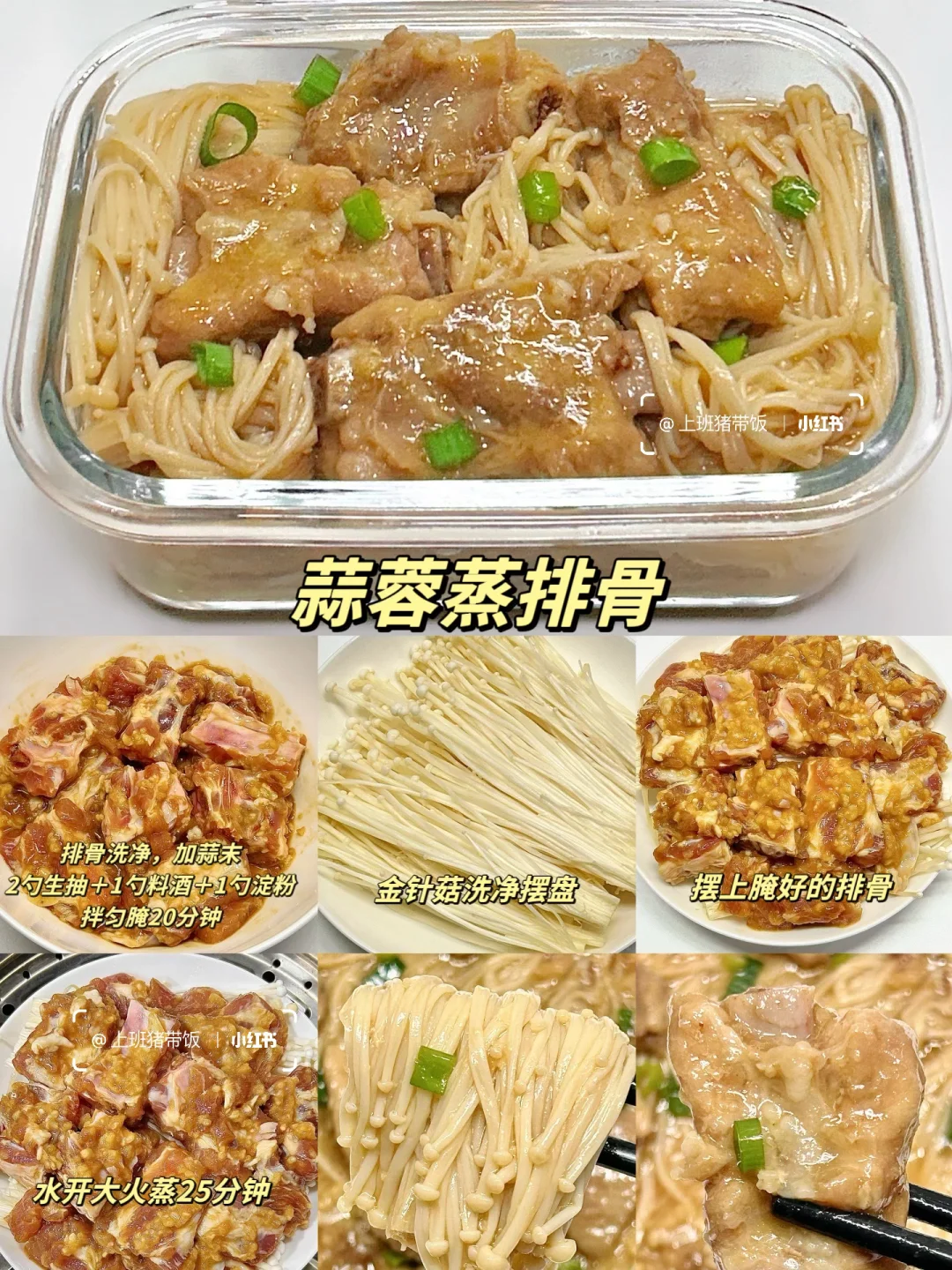 好冷啊,早上想多睡会儿,那我们就做蒸菜吧,简单省时间,有营养还能减脂,前晚就把肉类切好腌制放冰箱冷藏,早上起来先烧水再切蔬菜,水开了就上锅,定好时间就去洗漱化妆,收拾好了我的午餐也做好了,美美哒~~~ ﹣ 一周蒸菜合集 1⃣平菇蒸瘦肉 2⃣土豆蒸鸡胸肉 3⃣金针菇蒸瘦肉 4⃣南瓜蒸排骨 5⃣清蒸鸡翅 6⃣蒜蓉蒸排骨