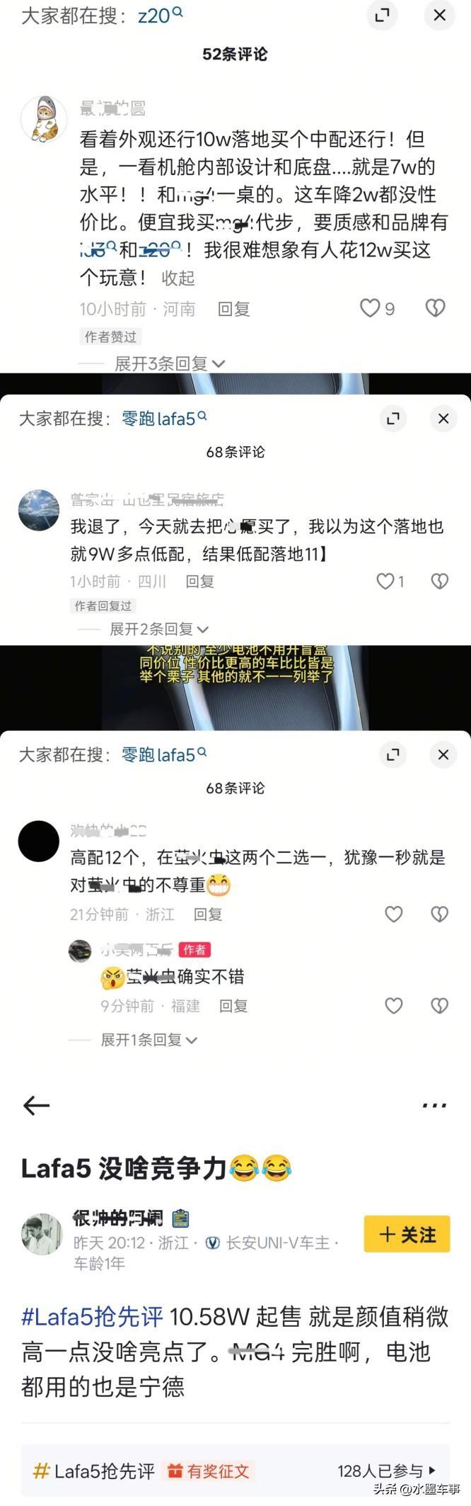 10.58万预售门槛有这配置,零跑Lafa5堪称电动高尔夫! 零跑Lafa5正式开启预售了,预售价格才10.58万。其实我之前去保养车的时候,在附近的零跑店里就看见过这车,真别说,那“法拉利黄”是真挺帅的。 有意思的是,就在Lafa5开启预售的同一天,新款的高尔夫GTI正式上市,这就有点儿意思了。我去查了下高尔夫GTI的价,敢情主播说的“真香价格”居然要21.19万元,我只能说情怀虽然是无价的,但我也是真买不起。 这再回头看,零跑Lafa5才是车香、价格也香,虽然它跟高尔夫GTI相比,一台是电动轿跑车、一台是燃油钢炮,萝卜青菜各有所爱,但底子里都是那种讲究运动个性的选手。 而真要说年轻感的话,反正我是更喜欢Lafa5这样的。一半的价格,6.4秒不光比2.0T的加速更快,什么8295+8650、什么激光雷达全都有,续航能达到605km,连Nappa真皮+仿麂皮超纤绒的座椅都用上了,真没什么好挑刺儿的。 就这样,我看网上还有人在说Lafa5价格高了、说配置一般什么的。要我说,这都车红是非多。Lafa5预售价格都比B10预售便宜了,用料配资都还更好。按零跑成本定价的调性,Lafa5正式上市价格肯定是价有所值的,毕竟真要拼配置,同价能赢它的可能真找不出几个。