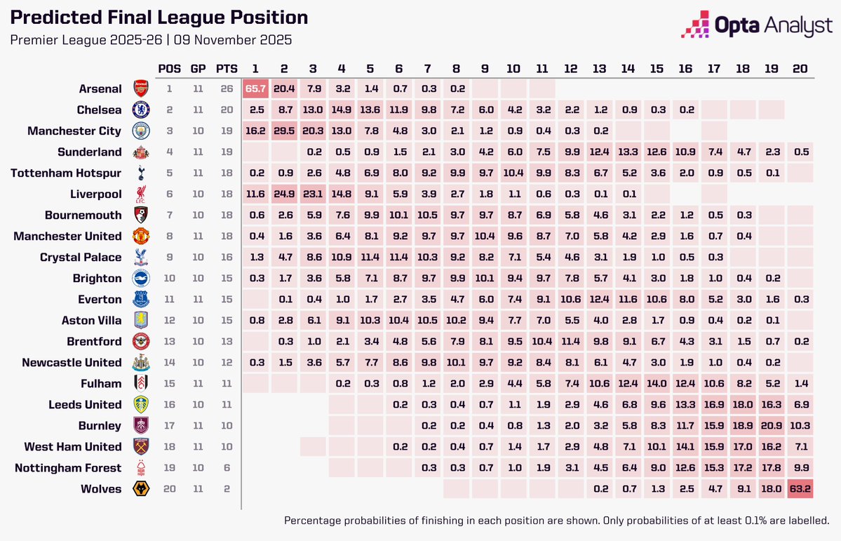 虎扑11月09日讯OPTA报道:尽管昨天在桑德兰战平,阿森纳在OPTA超级计算机当前模拟中仍以65.7%的概率赢得2025-26赛季英超冠军。