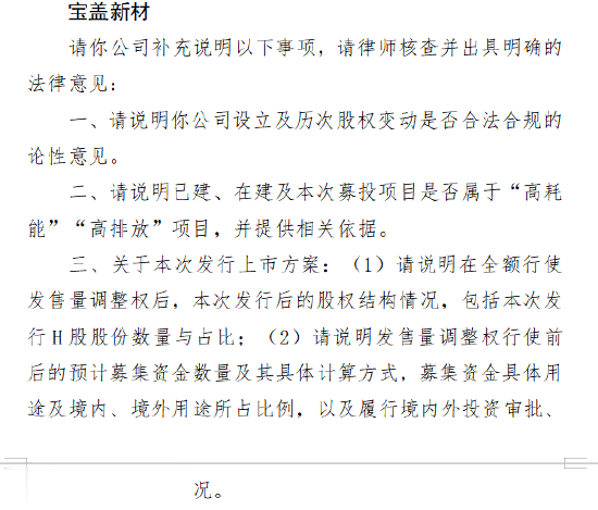 近日,宝盖新材收到证监会关于本次境外上市的备案反馈意见,具体反馈如下: