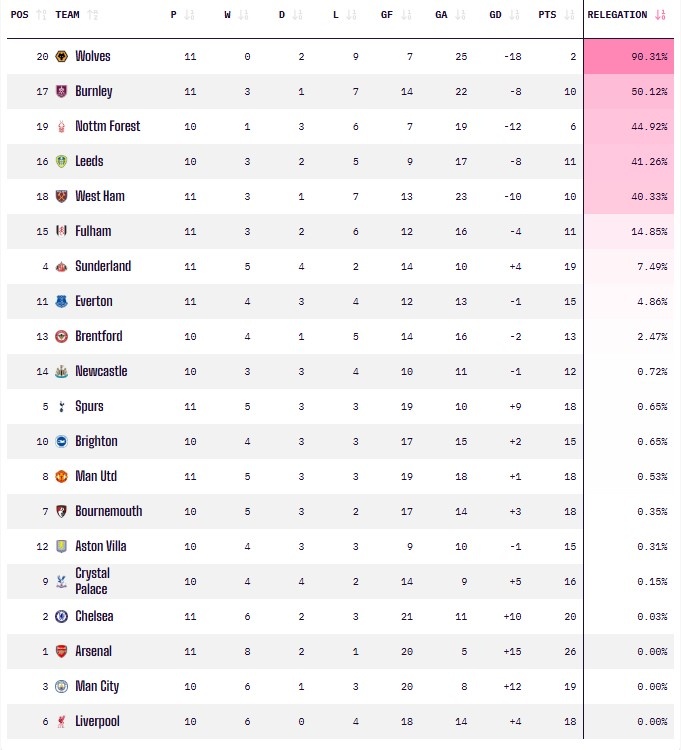 根据OPTA超级计算机的预测,狼队的降级概率已高达90.31%,伯恩利降级概率也超过5成为50.12%,排在伯恩利身后的为诺丁汉森林(44.92%)、利兹联(41.26%)、西汉姆联(40.33%)以及富勒姆(14.85%)。值得一提的是,身为升班马的桑德兰表现惊艳,目前他们在英超中高居第4位,降级概率仅为7.49%。
