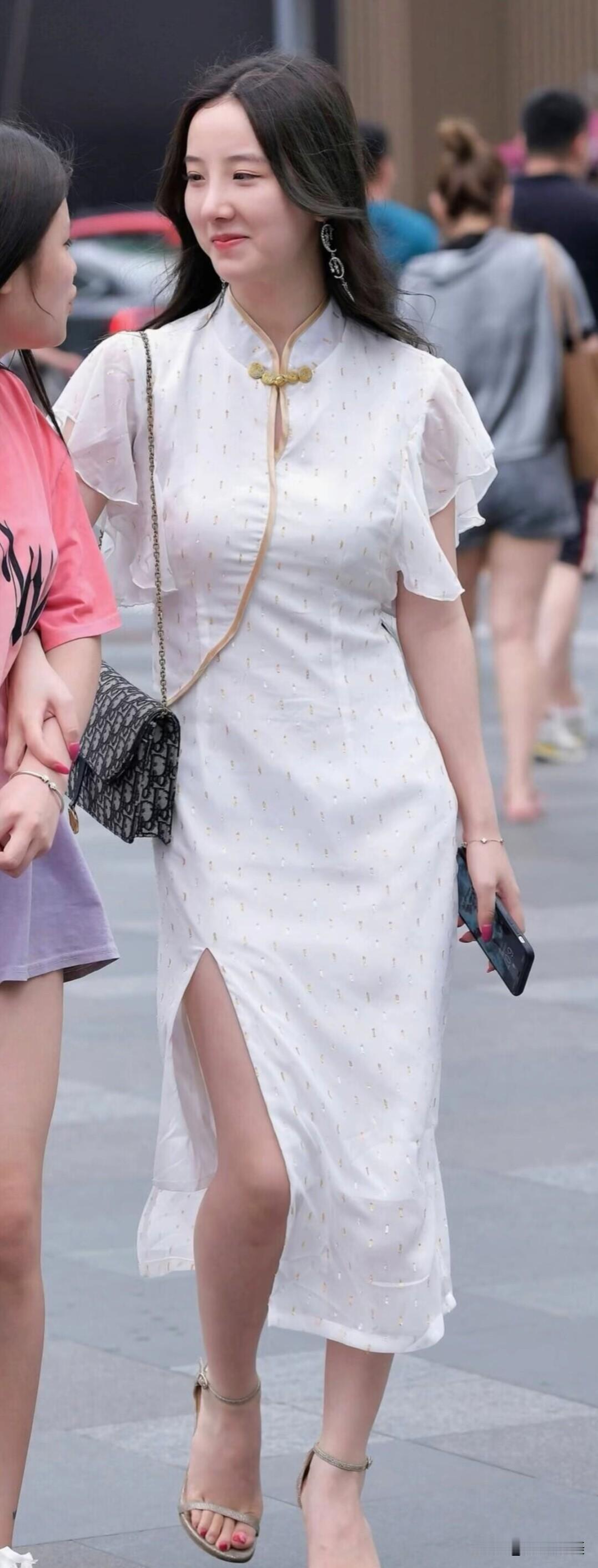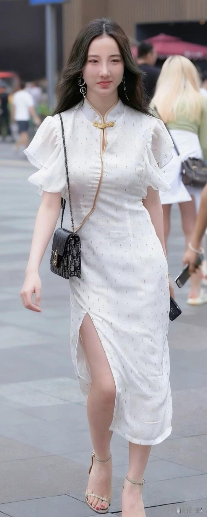 街头看到位穿白色旗袍的姑娘,走路带风,笑得好看。这身打扮挺有气质,像电视剧里走出来的。