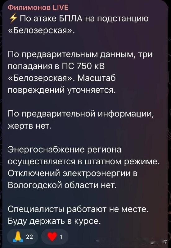 11月8日夜间,沃洛格达州的别洛泽尔斯卡娅750千伏变电站遭到袭击,当局称它被三次击中。 地理坐标:59.366496,37.882704 别洛泽尔斯卡娅750千伏变电站是俄罗斯的大型能源设施,位于沃洛格达州切列波韦茨区,于2004年投入运营,是该地区最大的供电中心。变电站的装机容量为1251兆伏安,工作电压为750/500/220/10千伏。 该变电站在中部与西北部联合能源系统中发挥关键作用,助力原子能电站及其他电站的电力输送。