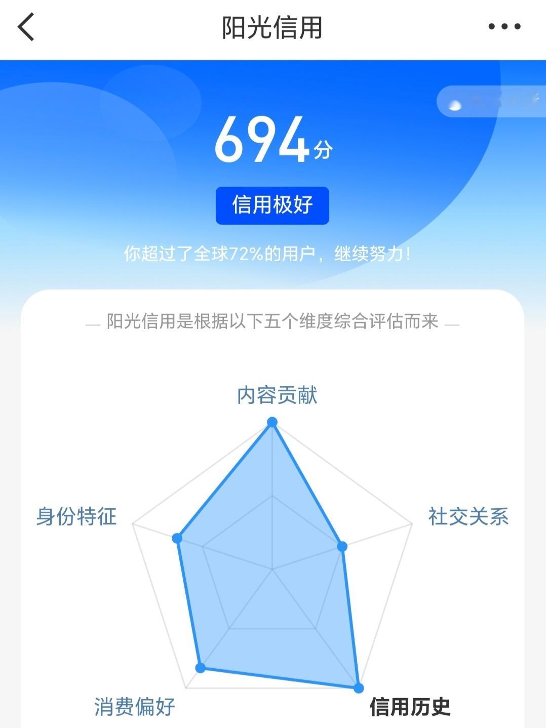 前天看阳光信用还是660,N多年的660,今天一看变成了694,足足涨了34分,信用极好了。[比心心]