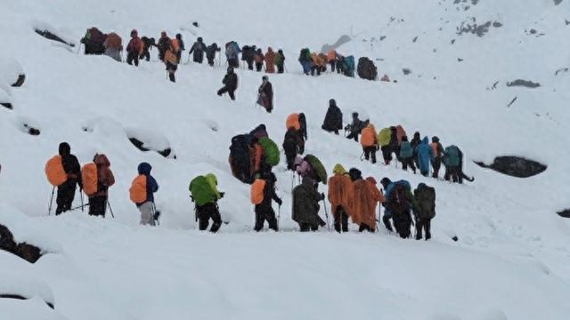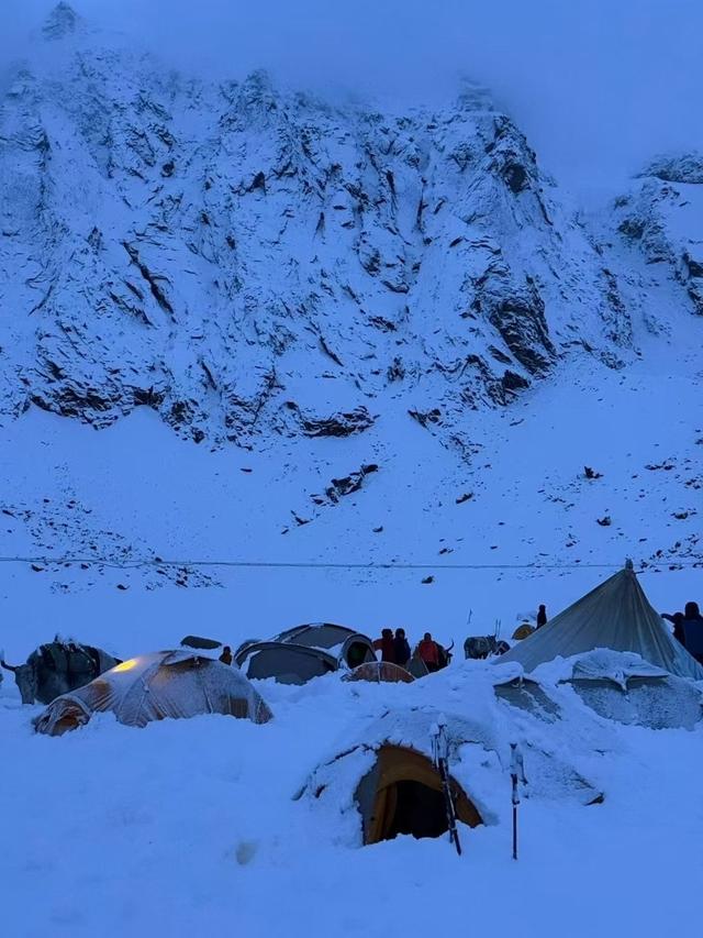 另一边,庞大的商团聚集处,四个大帐篷陆续被雪压塌。领队蒋凡从入夜时半个多小时清一次雪,变成每隔十几分钟就得清理。他越来越担心帐篷被压塌。前一天冒着冰雹和风雪前行,有些队员已经面色苍白、嘴唇发紫,隐约出现失温症状。蒋凡评估:降雪量可能已有40厘米,到了能下撤的极限条件。