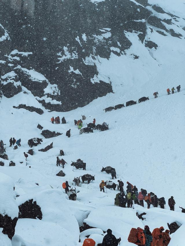 第二天一早,蒋凡和另外几个领队商量,想让牦牛开路。但商团人多,物资多,收拾起来需要时间,蒋凡的队伍落在了后面。向导们开路两三个小时后,才换成牦牛,其他人跟在后面走。一直走到离终点三公里的地方,他们终于见到救援人员。