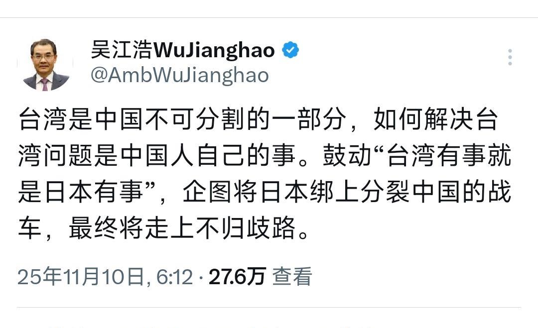 中国驻日本大使吴江浩今天(11月10日)发文写道:“台湾是中国不可分割的一部分,如何解决台湾问题是中国人自己的事。鼓动‘台湾有事就是日本有事’,企图将日本绑上分裂中国的战车,最终将走上不归歧路。” [机智]评几句:从安倍晋三到高市早苗,一直在鼓动“台湾有事就是日本有事”。这种行径是对中国内政的粗暴干涉,严重破坏地区和平稳定。日本部分政客为私利妄图挑动两岸对立,将日本拖入危险境地。中国驻日大使的表态清晰有力,台湾问题纯属中国内政。如果日本继续泯顽不灵,在错误道路上越走越远,那中国定不会坐视,新仇旧恨一起算,让其付出沉重代价。