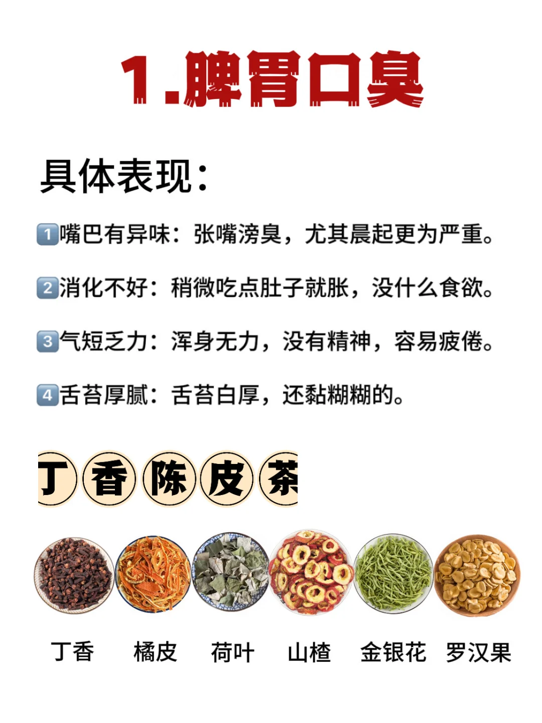 说句话就后退❓聊天总保持距离❓ 口臭问题真的影响心情和社交❗️ 今天分享4️⃣款终结口臭的清新茶饮 有口气的姐妹直接照搬!温和又管用,喝出自信好口气✨ . 1️⃣丁香陈皮茶 2️⃣茯苓薄荷茶 3️⃣金银花栀子茶 4️⃣决明子大麦茶 具体配方见图⬆️ . 姐妹们快来各取所需吧❗️ ·