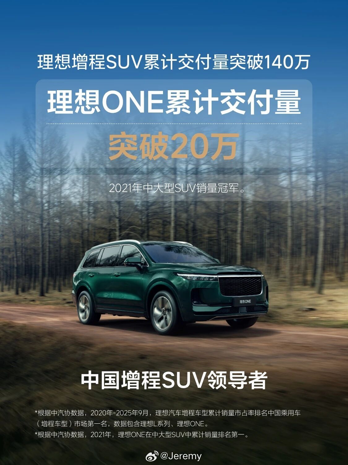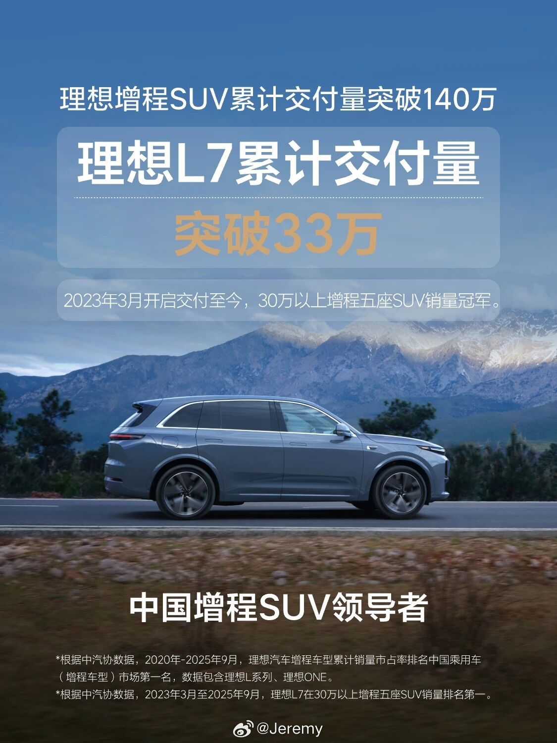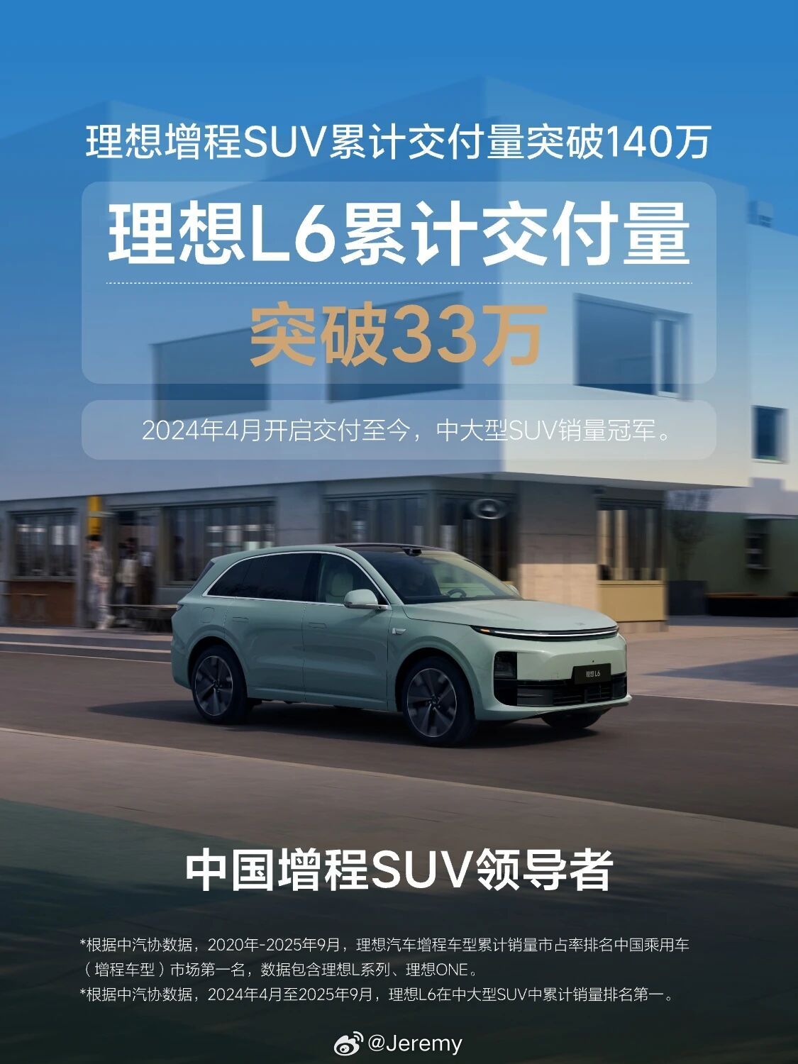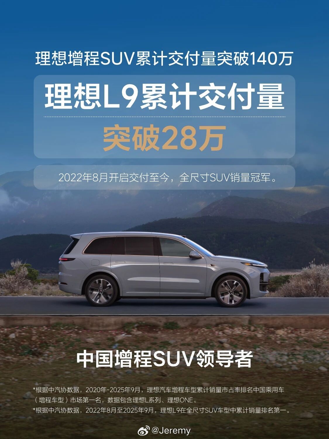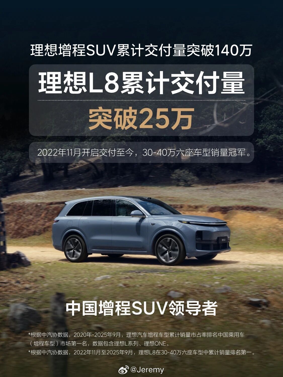 理想增程SUV交付突破140万辆 不愧是中国增程SUV领导者。[航天员]