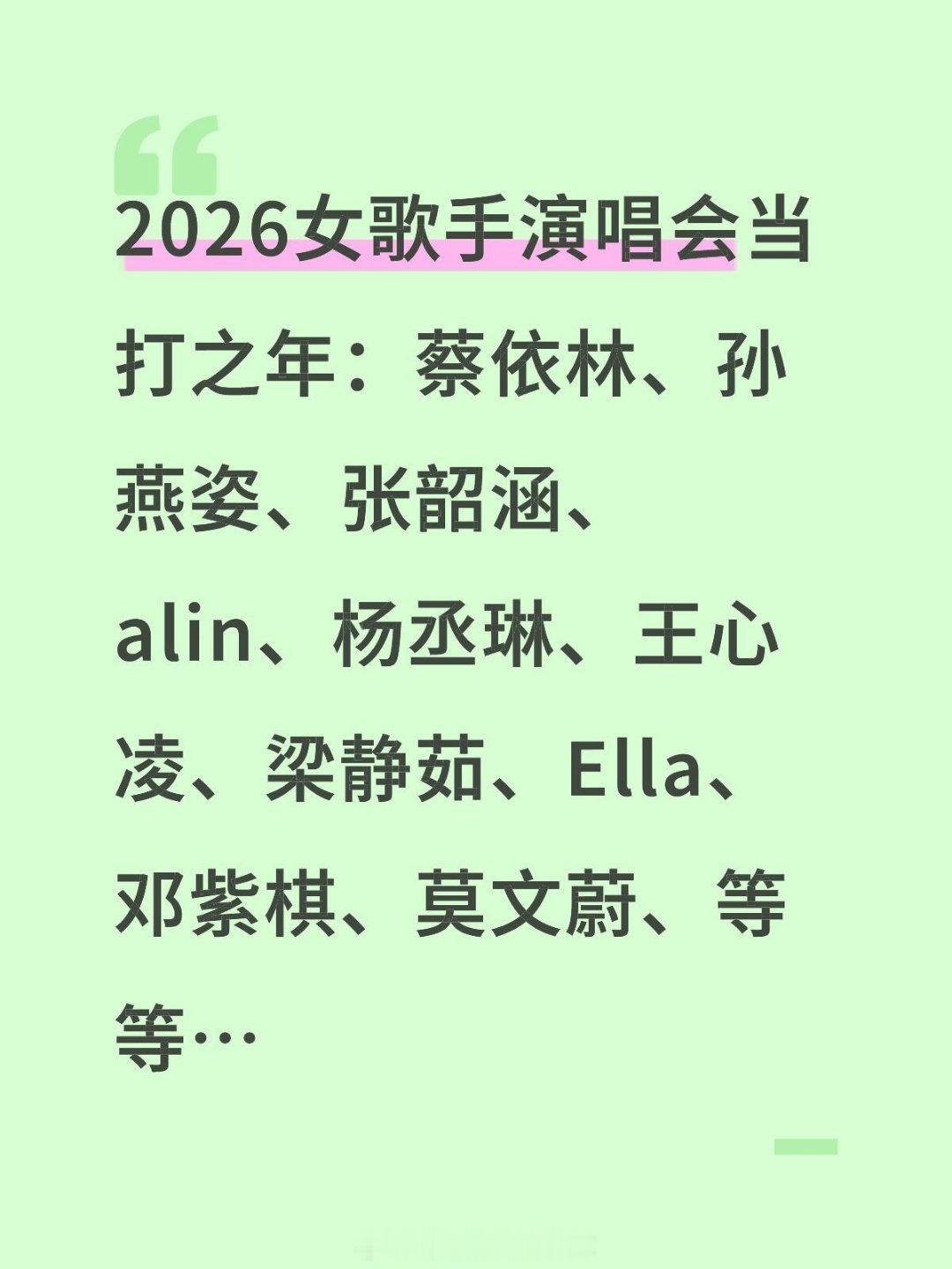 2026年歌手演唱会,女歌手真的是强强对打了:蔡依林、孙燕姿、张韶涵、alin、杨丞琳、王心凌、梁静茹、ella、邓紫棋。