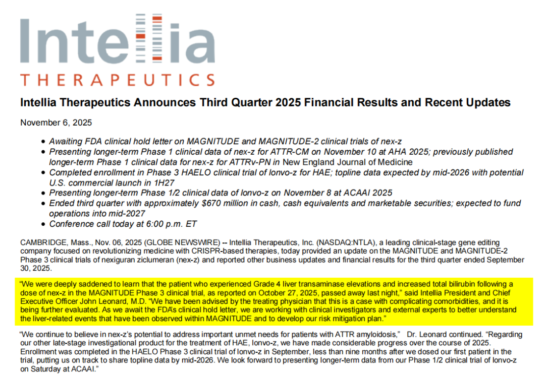 当地时间2025年11月6日,IntelliaTherapeutics公司(NASDAQ:NTLA)在发布的第三季度财务业绩及最新进展中披露,此前一名接受nex-z(NTLA-2001)治疗而出现严重肝毒性事件的患者已于11月5日晚间不幸离世。公司CEO透露,该患者合并有多种复杂疾病,具体死因仍在调查。