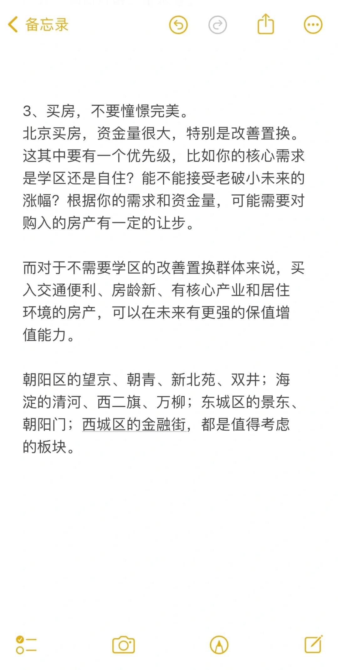 北京买房,资金量很大,特别是改善置换。这其中要有一个优先级,比如你的核心需求是学区还是自住?能不能接受老破小未来的涨幅?根据你的需求和资金量,可能需要对购入的房子有一定的让步。
