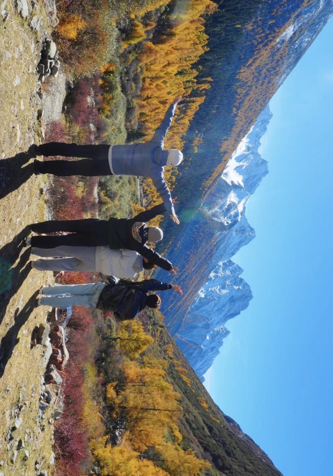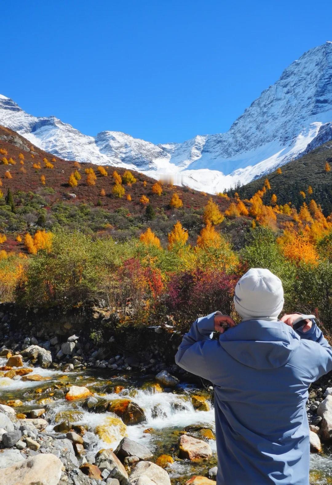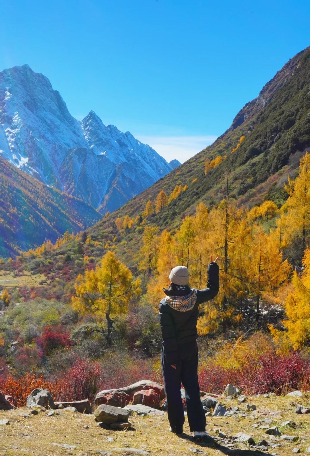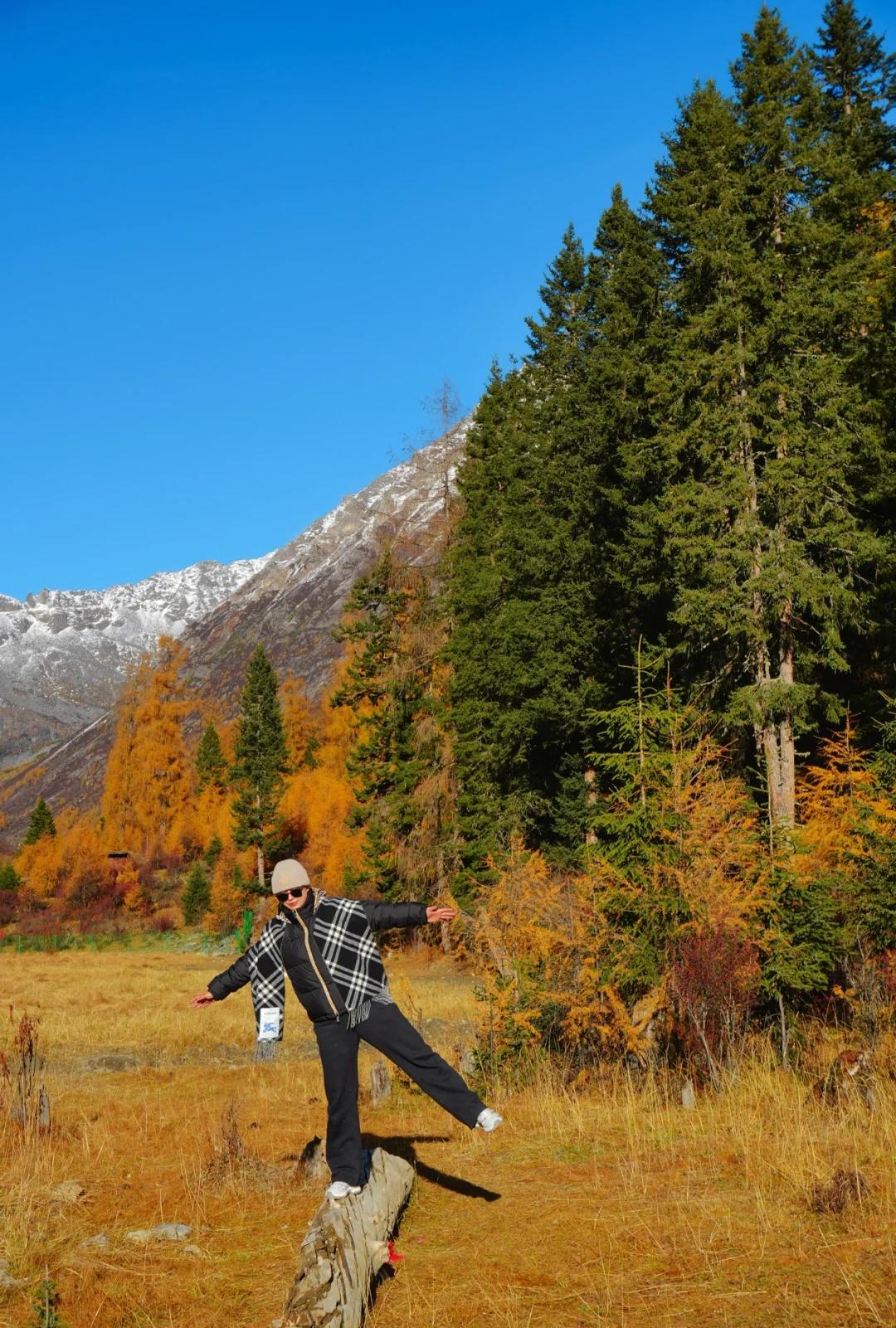 川西的秋色,不虚此行 这次整个围绕四姑娘山展开的自驾之行(11.4-5)运气爆表,两日都是大晴天,还有幸目睹日月同辉,日照金山。而结斯沟的深入探索更是惊喜连连。 - day1:双桥沟(图2—5) 自驾翻越巴郎山下午到达双桥沟景区。 提前定好景区门票,刷身份证进入景区。三点停止检票,摆渡车五点半最后一班下山,想要玩的尽兴一点可以早一点到景区从上往下玩,遗憾的是漂流项目五点停止,我们没有赶上。 - day2:理小路 ICE AXE COFFEE—结斯沟—大二普—回家(图1,图8-14结斯沟,图15-18大二普) 一早出发在ICE AXE喝了咖啡就沿理小路段出发去小众秘境结斯沟探索。 导航至“向花村一组”,车开至平坦好路的尽头,驾驶轿车或者公路胎suv的车主建议下车坐村民的中转车上山,山里大多是有炮弹坑的碎石路,还会经过一个小水坑,错车麻烦,爆胎风险较大。我们四个人坐中转车花费300元,这简直是川西自己的迪士尼项目,一路抖出电音,抖落肾结石。司机人很热情,情绪价值给够。AT胎越野车可以直接开上去,中途遇到美景可以随时停车驻足或搭棚露营更自由惬意。(山里无信号,只有一条路上山) 行路至一半便看见了整个行程中最美的彩林,如烟花绽放般五彩斑斓,美的想流泪。行至山上停车的大平台便是车辆可达的终点,这里四面被雪山和冰川环绕,中间有一滩雪水消融形成的小湖泊,湖光山色交相辉映,静谧空灵。这与外界断联的三个小时,感官放大,美景尽收眼底,是我这周度过最美好的时光。 在赏过结斯沟的美景后,大二普对我来说就平平无奇,而且人很多,体验感没有那么好。 - 往理县方向回家的路上一路绕着雪山开,再一次幸运的看到日照金山,给这次的川西行画上完美的句号。 秋日散步美学 玩秋不如赏秋 秋天去看彩林 人间仙境 川西自驾 川西攻略 川西秋景 四姑娘山 四姑娘山双桥沟 秋日旅行 雪山上的秋景 彩林攻略 被秋天治愈的瞬间 川西拍照 一半仙境一半人间 每周一山 户外徒步 秋日川西 好像拍到了人生照片 旅游编辑部 秋日到站计划结斯沟 @摄影薯
