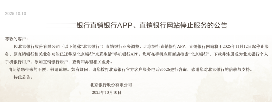 10月上旬,北京银行发布公告称,因直销银行业务调整,北京银行直销银行App、直销银行网站将于2025年11月12日起停止服务,原直销银行相关业务功能已迁移至北京银行“京彩生活”手机银行App。