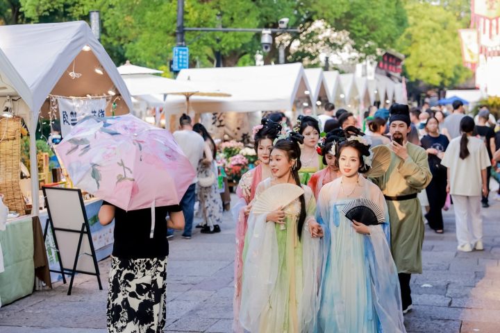 在桥西历史文化街区,集中展现了老杭州的非遗生活,手工艺活态馆内延续着剪纸、油纸伞、篆刻等传统技艺,匠人们以指尖的温度守护着时光的记忆。而“第五届长三角菊花艺术节”,更添一份宋人风雅。簪花、插花、古琴、香道、茶道等体验活动依次排开,再现宋式“四般闲事”的精致生活美学。游客也能在此与华丽的高跷货郎——《市郎图》高跷巡游在古街上不期而遇。或联动运河艺术园区的亲子艺术活动,让传统文化在代际间温暖传递。