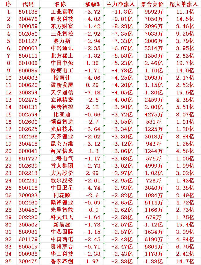 11月11日上午盘,主力趁低位,大幅买入的35名单: 方大炭素:涨幅 +9.98%,净流入 5.20亿元 江波龙:涨幅 +11.65%,净流入 4.23亿元 永鼎股份:涨幅 +7.09%,净流入 4.03亿元 协鑫集成:涨幅 +10.04%,净流入 3.90亿元 兆易创新:涨幅 +1.43%,净流入 3.83亿元 1月11日中午收盘,主力资金“大幅卖出”的35名单: 工业富联:涨幅 -3.72%,净流入 -11.3亿元 胜宏科技:涨幅 -4.02%,净流入 -9.01亿元 东方财富:涨幅 -1.42%,净流入 -8.28亿元 三花智控:涨幅 -2.92%,净流入 -7.35亿元 赛力斯:涨幅 -2.94%,净流入 -7.33亿元