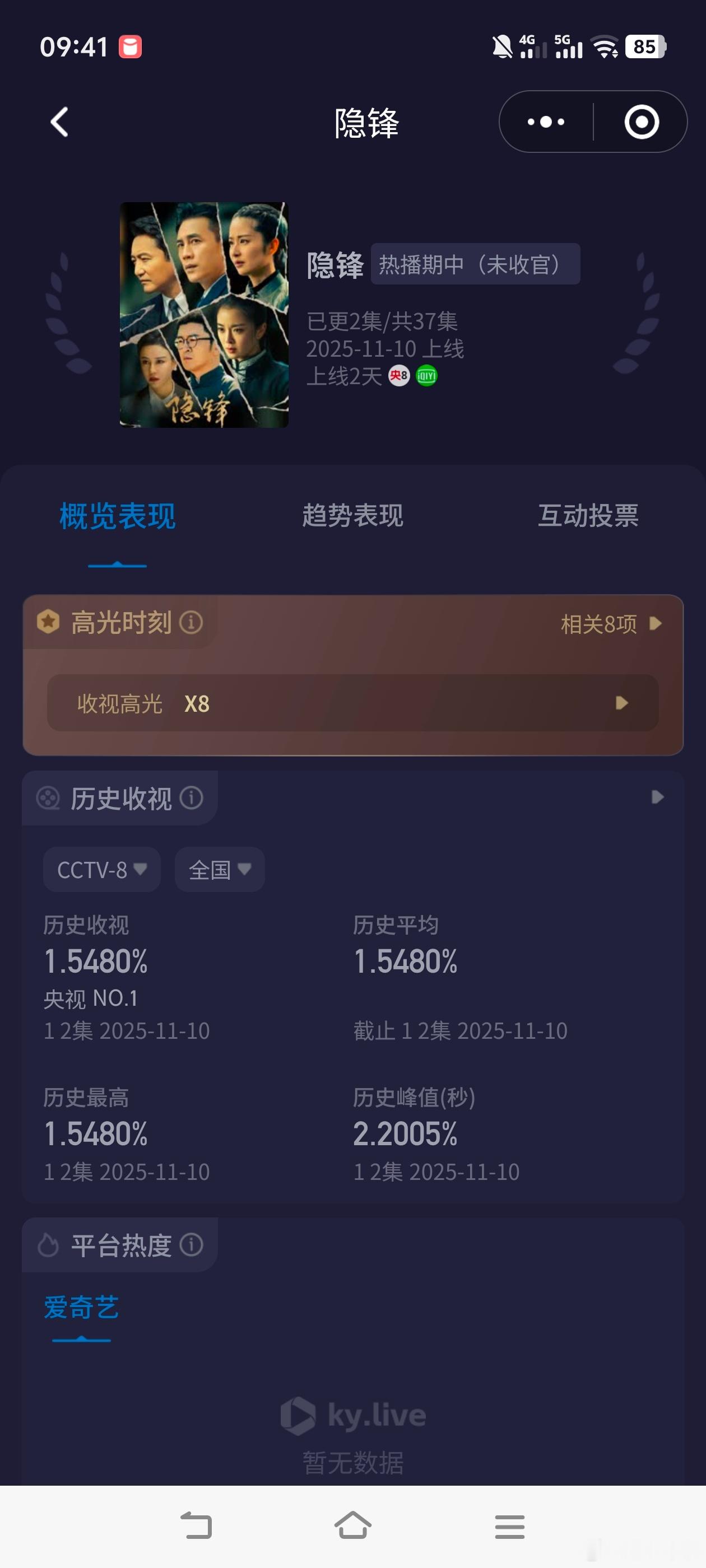 电视剧隐锋杜淳 颖儿 《隐锋》首播收视快报!峰值2.2005,平均1.5480!单集cvb估值:1.9189×0.85=1.631
